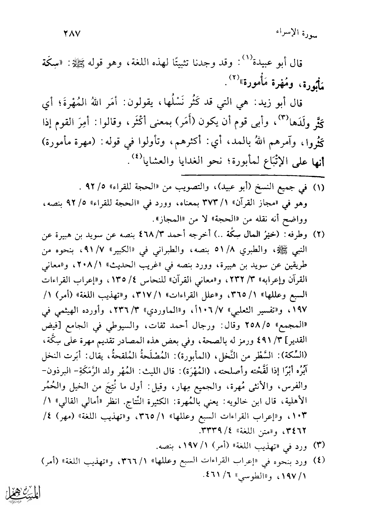 (¬2) وطرفه: (خيْرُ المال سِكَّة ..) أخرجه أحمد 3/ 468 بنصه عن سويد بن هبيرة عن النبي -صلى الله عليه وسلم-، والطبري 8/ 51 بنصه، والطبراني في "الكبير" 7/ 91، بنحوه من طريقين عن سويد بن هبيرة، وورد بنصه في "غريب الحديث" 1/ 208، و"معاني القرآن وإعرابه" 3/ 232، و"معاني القرآن" للنحاس 4/ 135، و"إعراب القراءات السبع وعللها" 1/ 365، و"علل القراءات" 1/ 317، و"تهذيب اللغة" (أمر) 1/ 197، و"تفسير الثعلبي" 7/ 106 أ، و"الماوردي" 3/ 236، وأورده الهيثمي في "المجمع" 5/ 258 وقال: ورجال أحمد ثقات، والسيوطي في الجامع [فيض القدير] 3/ 491 ورمز له بالصحة، وفي بعض هذه المصادر تقديم مهرة على سِكَّة، (السِّكة): السَّطْر من النَّخل، (المأبورة): المُصْلَحةُ المُلقحةُ، يقال: أبَرت النخل آبُرُه أبْرًا إذا لَقَّحْته وأصلحته، (المُهْرَة): قال الليث: المُهْر ولد الرَّمَكَةِ -البرذون- والفرس، والأنثى مُهرة، والجميع مِهار، وقيل: أول ما نُتِجَ من الخيل والحُمُر الأهلية، قال ابن خالويه: يعني بالمُهرة: الكثيرة النِّتاج. انظر "أمالي القالي" 1/ 103، و"إعراب القراءات السبع وعللها" 1/ 365، و"تهذيب اللغة" (مهر) 4/ 3462، و"متن اللغة" 4/ 3339.