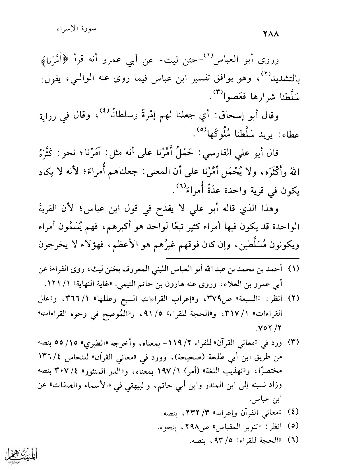 قال أبو علي الفارسي: حَمْلُ أَمَّرْنا على أنه مثل: آمَرْنا؛ نحو: كَثَّرَهُ اللهُ وأَكْثَرَه، ولا يُحْمَل أمَّرْنا على أن المعنى: جعلناهم أُمراءَ؛ لأنه لا يكاد يكون في قرية واحدة عدّةُ أُمراءَ (¬6).