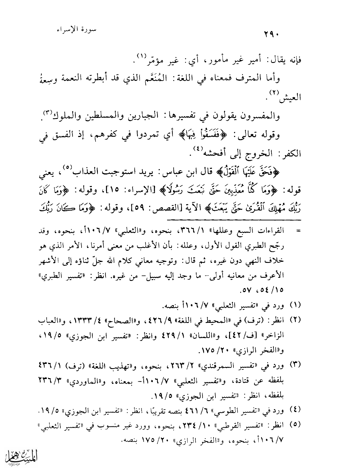 (¬3) ورد في "تفسير السمرقندي" 2/ 263، بنحوه، و"تهذيب اللغة" (ترف) 1/ 436 بلفظه عن قتادة، و"تفسير الثعلبي" 7/ 106 أ - بمعناه، و"الماوردي" 3/ 236 بلفظه، انظر: "تفسير ابن الجوزي" 5/ 19.