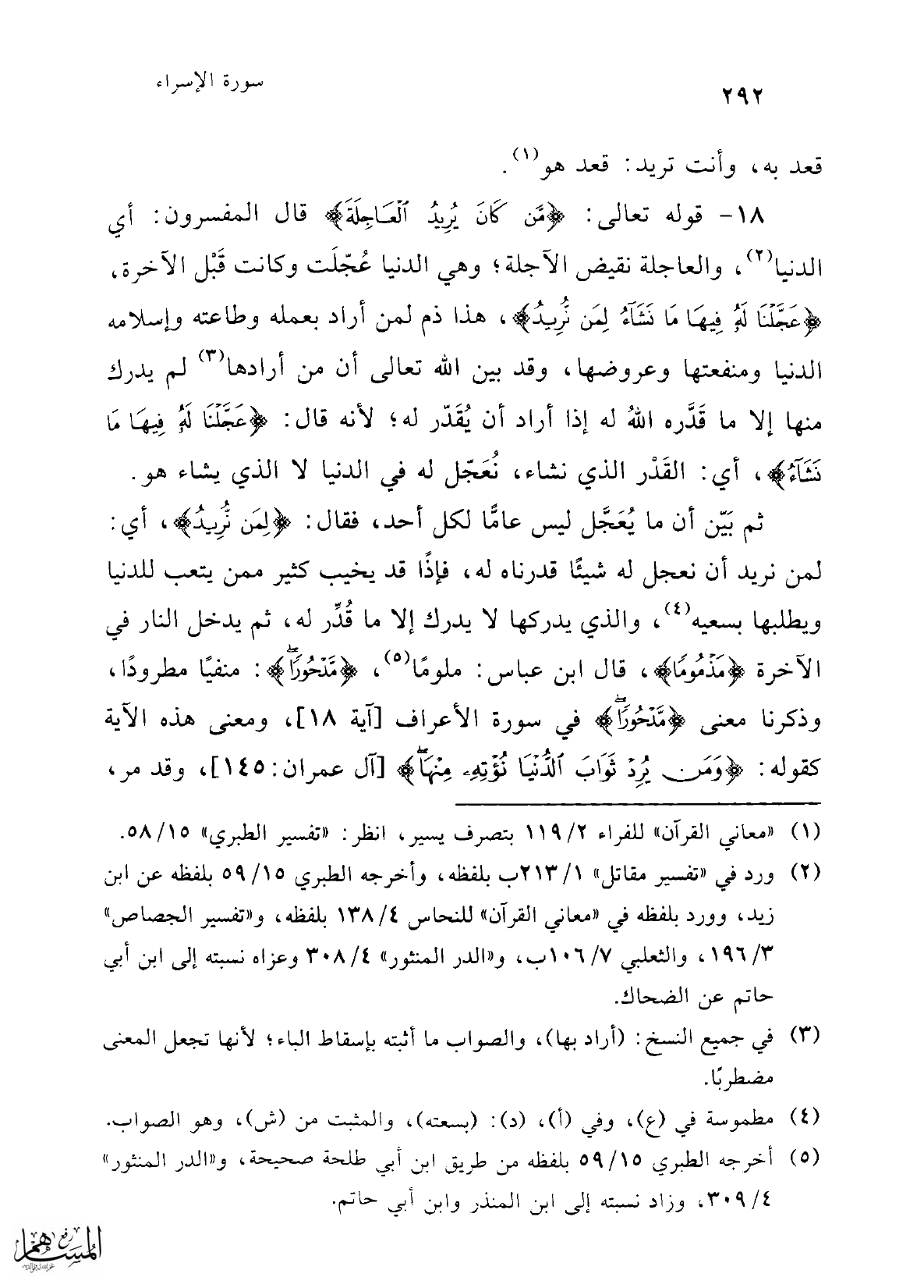 ثم بَيّن أن ما يُعَجَّل ليس عامًّا لكل أحد، فقال: {لِمَنْ نُرِيدُ}، أي: لمن نريد أن نعجل له شيئًا قدرناه له، فإذًا قد يخيب كثير ممن يتعب للدنيا ويطلبها بسعيه (¬4)، والذي يدركها لا يدرك إلا ما قُدِّر له، ثم يدخل النار في الآخرة {مَذْمُومًا}، قال ابن عباس: ملومًا (¬5)، {مَدْحُورًا}: منفيًا مطرودًا، وذكرنا معنى {مَدْحُورًا} في سورة الأعراف [آية 18]، ومعنى هذه الآية كقوله: {وَمَنْ يُرِدْ ثَوَابَ الدُّنْيَا نُؤْتِهِ مِنْهَا} [آل عمران: 145]، وقد مر،