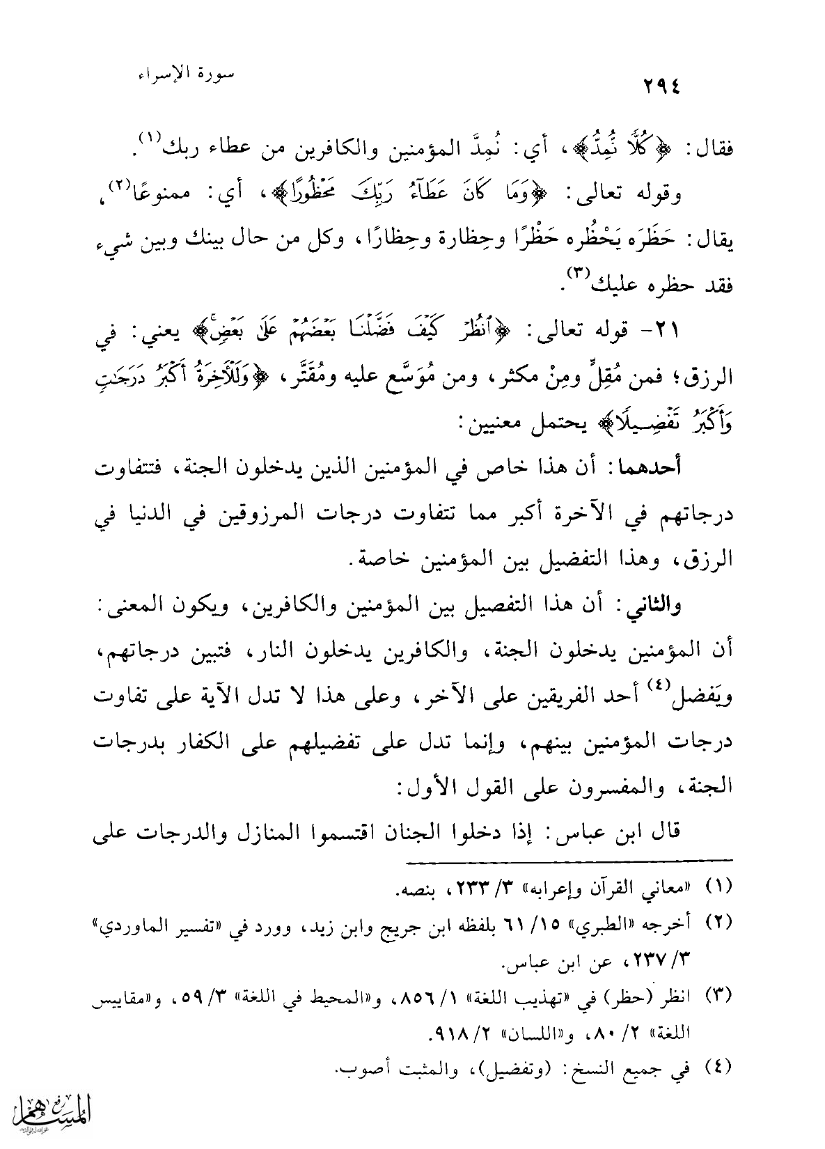 والثاني: أن هذا التفصيل بين المؤمنين والكافرين، ويكون المعنى: أن المؤمنين يدخلون الجنة، والكافرين يدخلون النار، فتبين درجاتهم، وَيفضل (¬4) أحد الفريقين على الآخر، وعلى هذا لا تدل الآية على تفاوت درجات المؤمنين بينهم، وإنما تدل على تفضيلهم على الكفار بدرجات الجنة، والمفسرون على القول الأول: