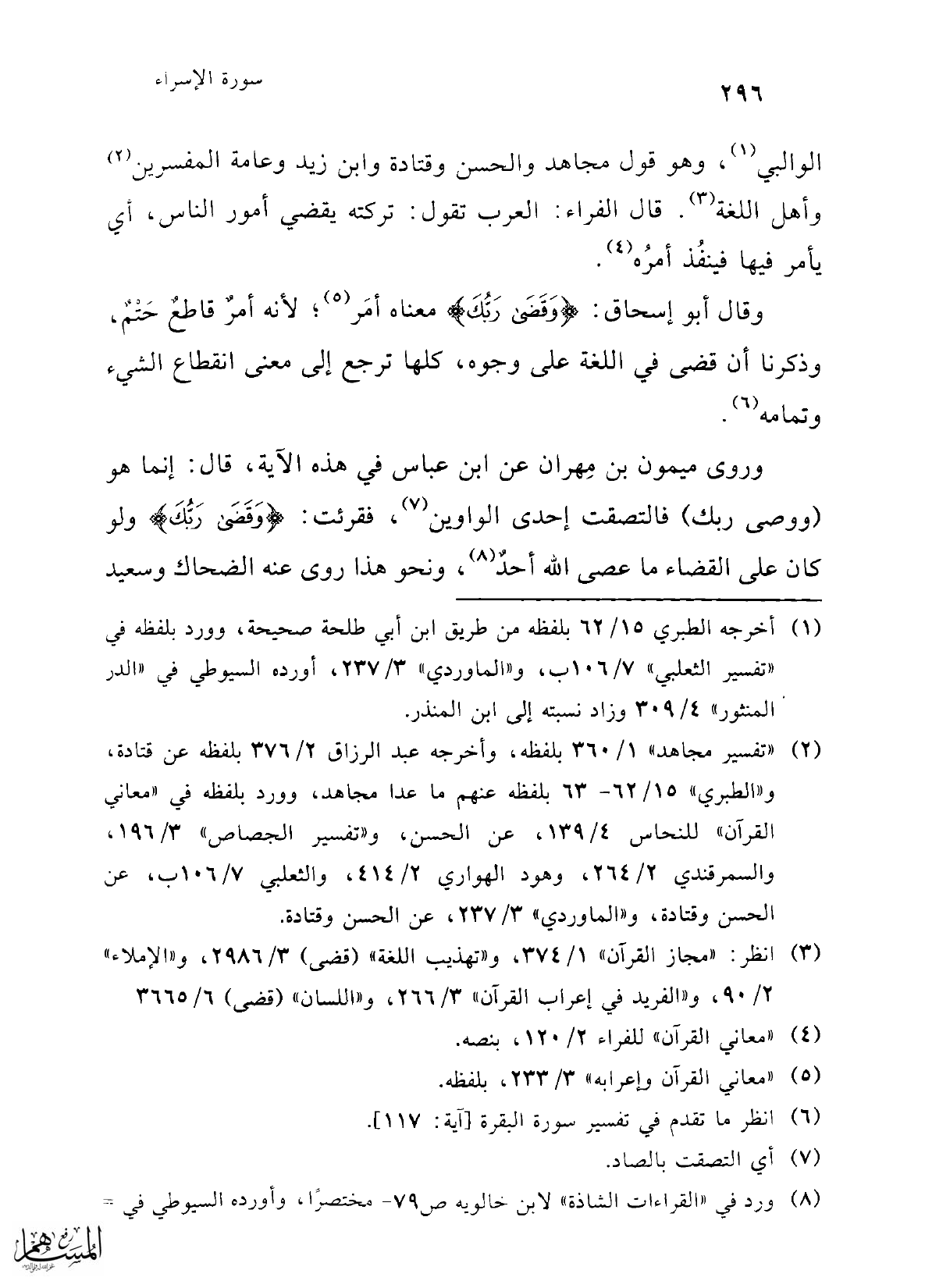 وروى ميمون بن مِهران عن ابن عباس في هذه الآية، قال: إنما هو (ووصى ربك) فالتصقت إحدى الواوين (¬7)، فقرئت: {وَقَضَى رَبُّكَ} ولو كان على القضاء ما عصى الله أحدٌ (¬8)، ونحو هذا روى عنه الضحاك وسعيد