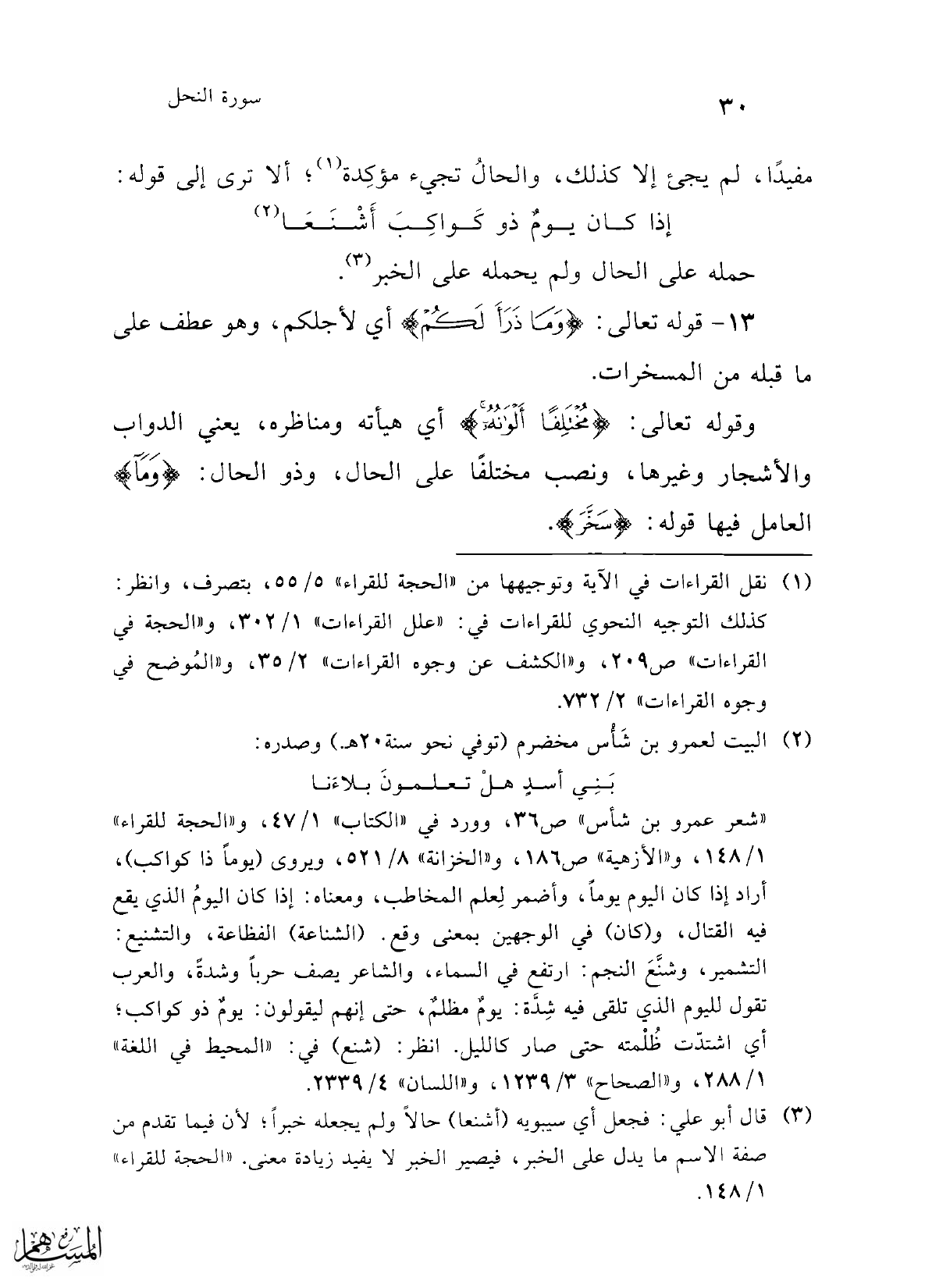 13 - قوله تعالى: {وَمَا ذَرَأَ لَكُمْ} أي لأجلكم، وهو عطف على ما قبله من المسخرات.