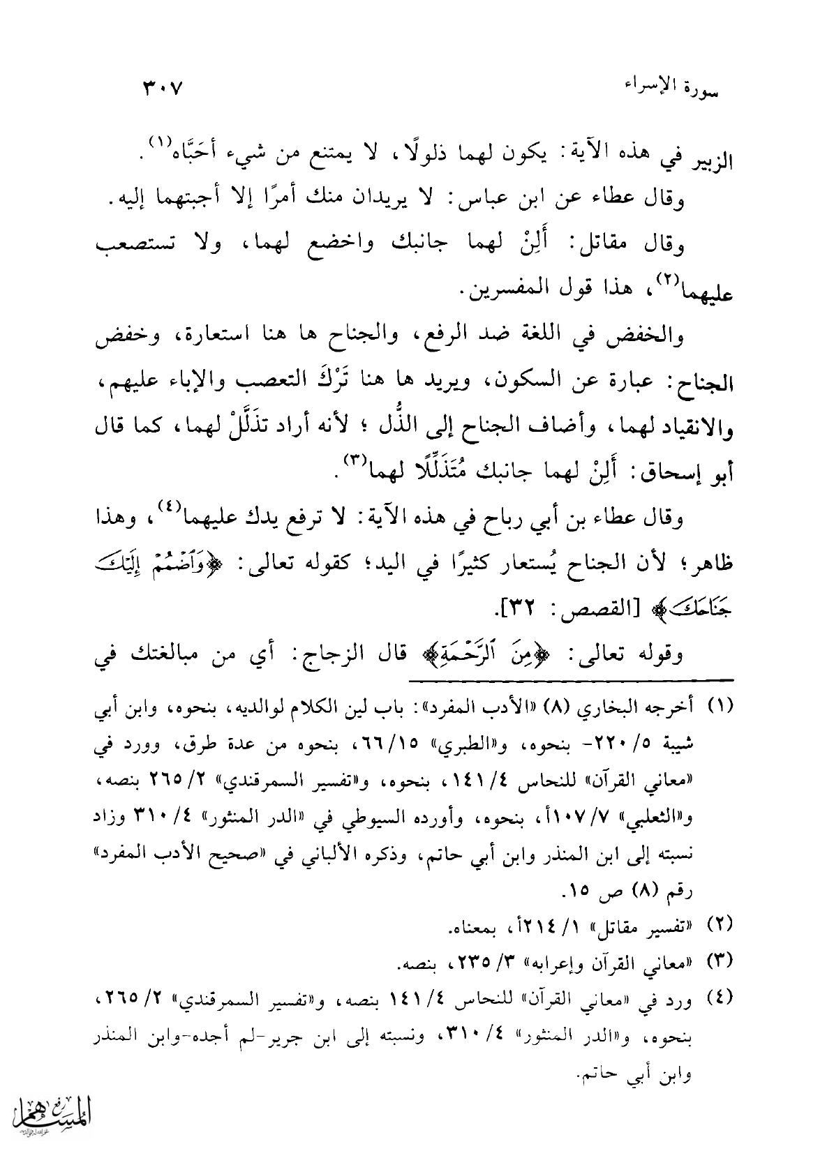 وقال عطاء بن أبي رباح في هذه الآية: لا ترفع يدك عليهما (¬4)، وهذا ظاهر؛ لأن الجناح يُستعار كثيرًا في اليد؛ كقوله تعالى: {وَاضْمُمْ إِلَيْكَ جَنَاحَكَ} [القصص: 32].