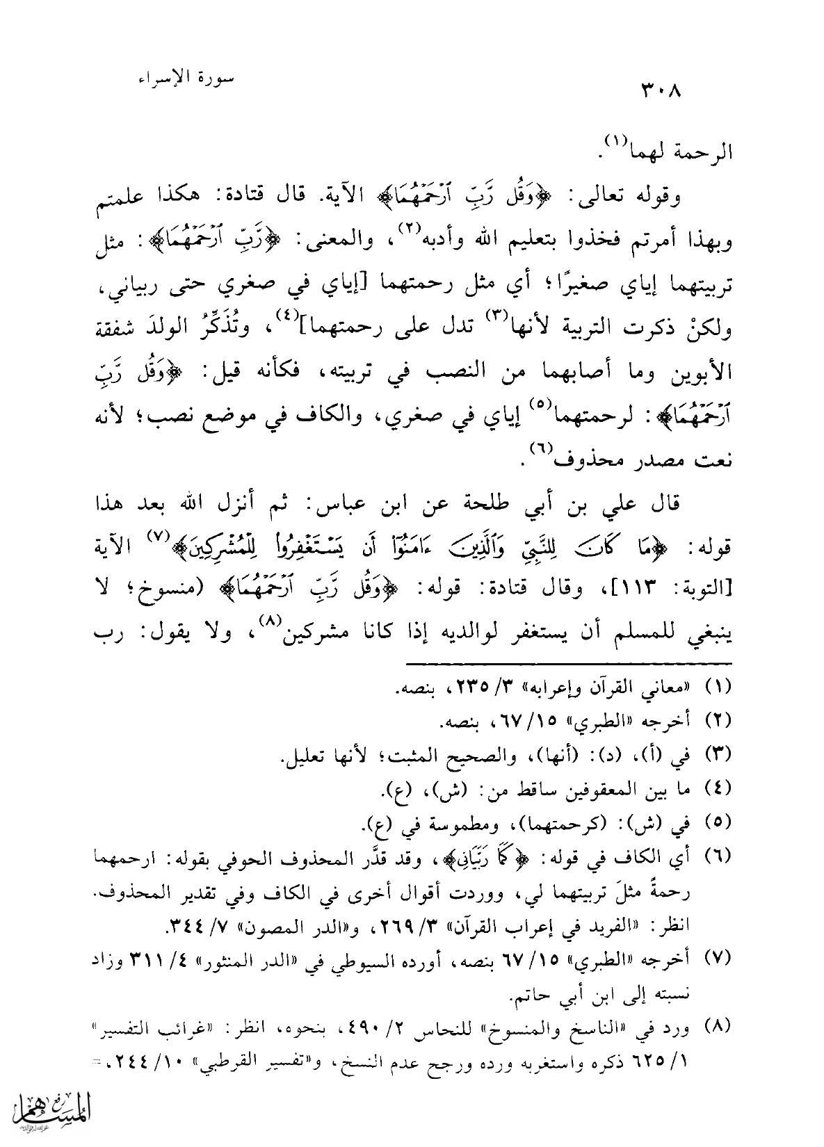 (¬6) أي الكاف في قوله: {كَمَا رَبَّيَانِي}، وقد قدَّر المحذوف الحوفي بقوله: ارحمهما رحمةً مثلَ تربيتهما لي، ووردت أقوال أخرى في الكاف وفي تقدير المحذوف. انظر: "الفريد في إعراب القرآن" 3/ 269، و"الدر المصون" 7/ 344.