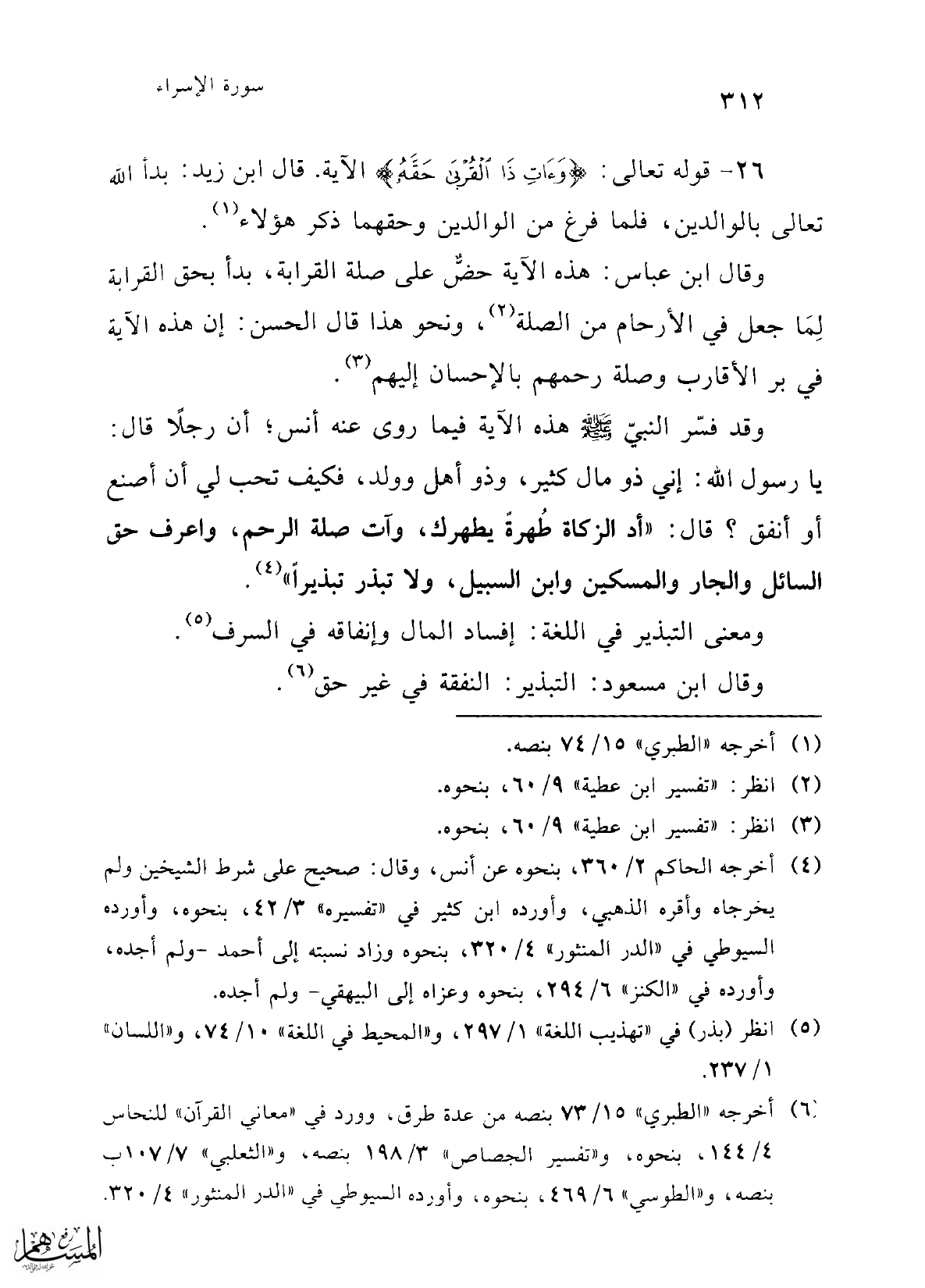 وقد فسّر النبيّ -صلى الله عليه وسلم- هذه الآية فيما روى عنه أنس؛ أن رجلًا قال: يا رسول الله: إني ذو مال كثير، وذو أهل وولد، فكيف تحب لي أن أصنع أو أنفق؟ قال: "أد الزكاة طُهرةً يطهرك، وآت صلة الرحم، واعرف حق السائل والجار والمسكين وابن السبيل، ولا تبذر تبذيرًا" (¬4).