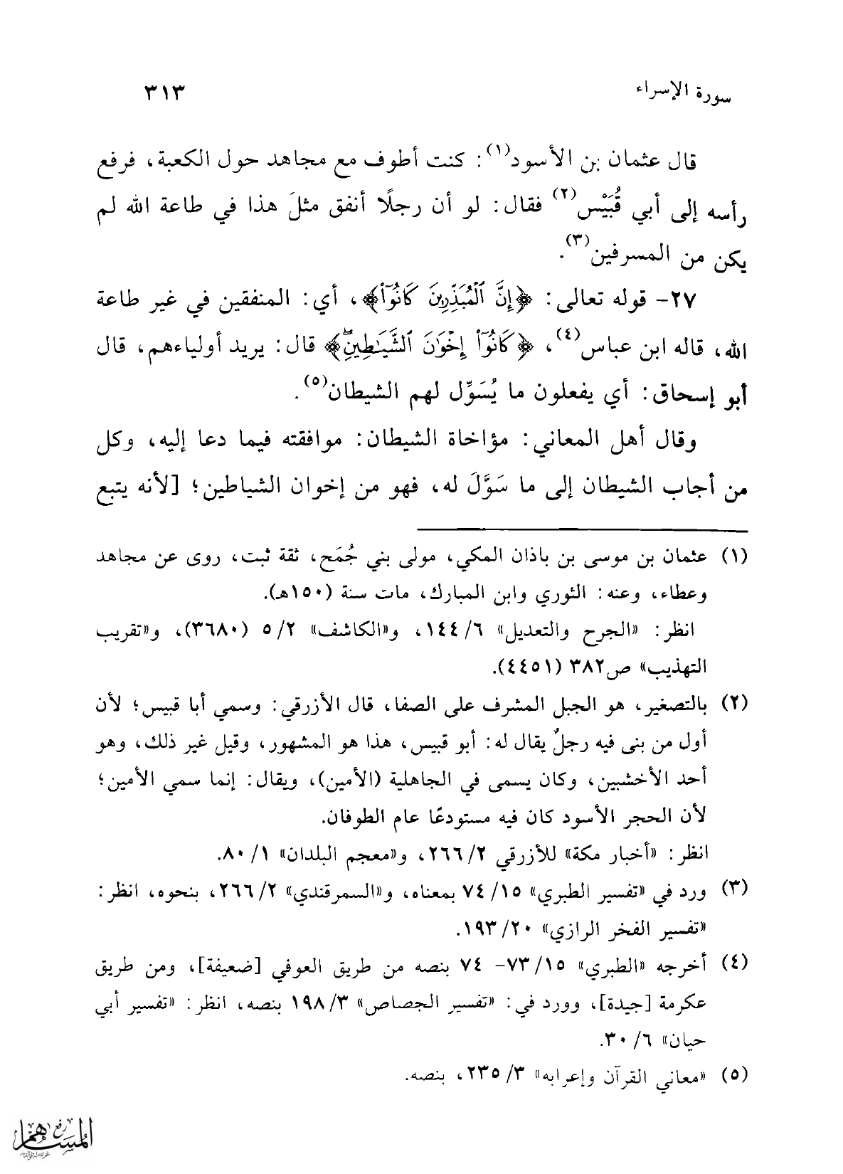 27 - قوله تعالى: {إِنَّ الْمُبَذِّرِينَ كَانُوا}، أي: المنفقين في غير طاعة الله، قاله ابن عباس (¬4)، {كَانُوا إِخْوَانَ الشَّيَاطِينِ} قال: يريد أولياءهم، قال أبو إسحاق: أي يفعلون ما يُسَوَّل لهم الشيطان (¬5).