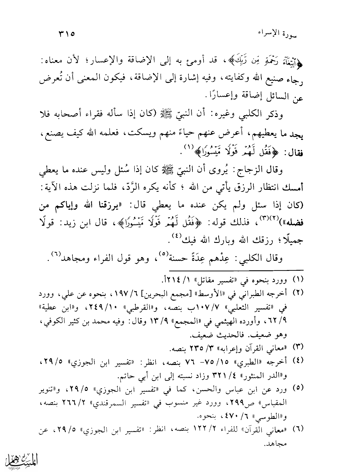 وذكر الكلبي وغيره: أن النبيّ -صلى الله عليه وسلم- (كان إذا سأله فقراء أصحابه فلا يجد ما يعطيهم، أعرض عنهم حياءً منهم ويسكت، فعلمه الله كيف يصنع، فقال: {فَقُلْ لَهُمْ قَوْلًا مَيْسُورًا} (¬1).