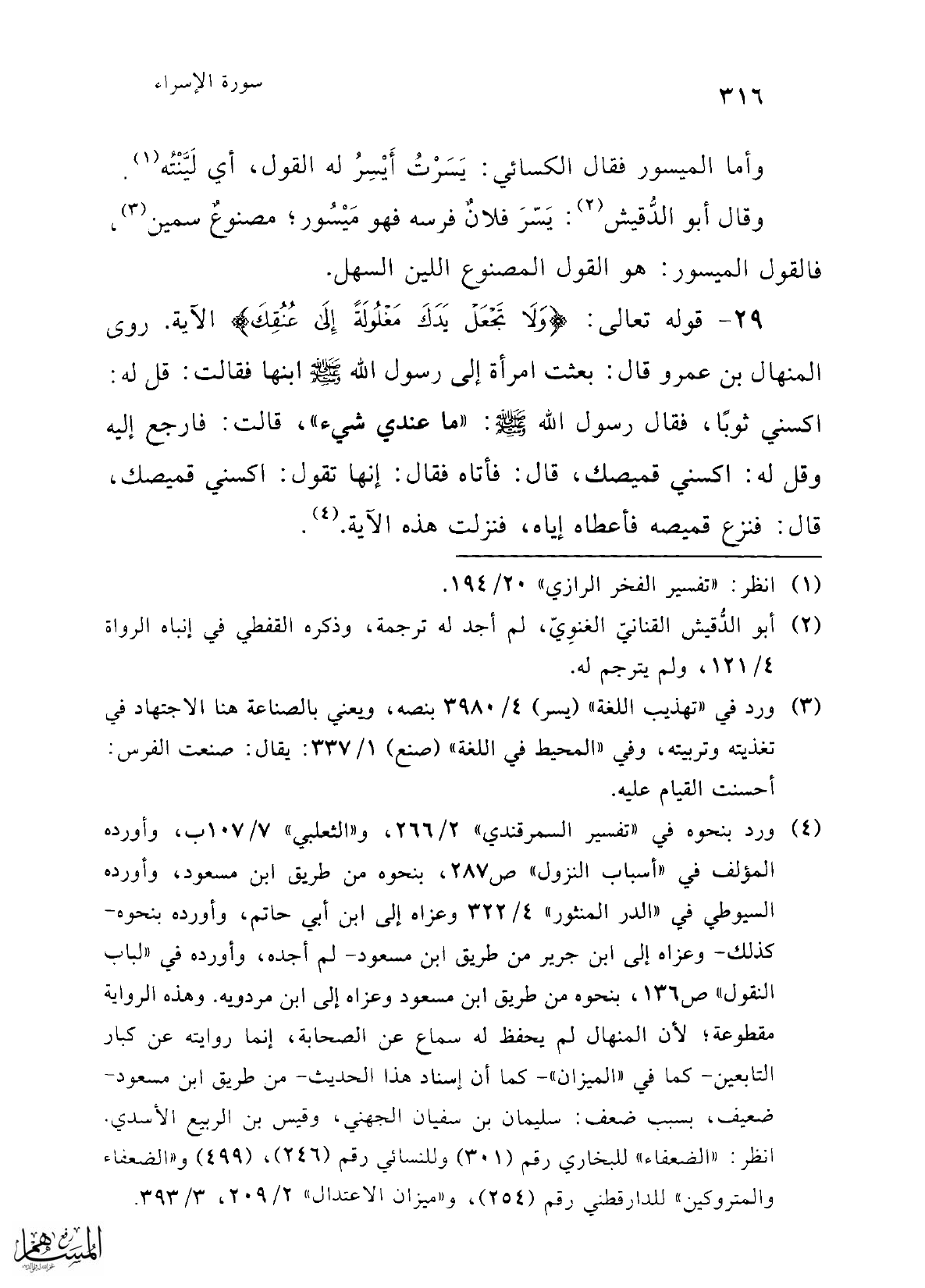 29 - قوله تعالى: {وَلَا تَجْعَلْ يَدَكَ مَغْلُولَةً إِلَى عُنُقِكَ} الآية. روى المنهال بن عمرو قال: بعثت امرأة إلى رسول الله -صلى الله عليه وسلم- ابنها فقالت: قل له: اكسني ثوبًا، فقال رسول الله -صلى الله عليه وسلم-: "ما عندي شيء"، قالت: فارجع إليه وقل له: اكسني قميصك، قال: فأتاه فقال: إنها تقول: اكسني قميصك، قال: فنزع قميصه فأعطاه إياه، فنزلت هذه الآية. (¬4).