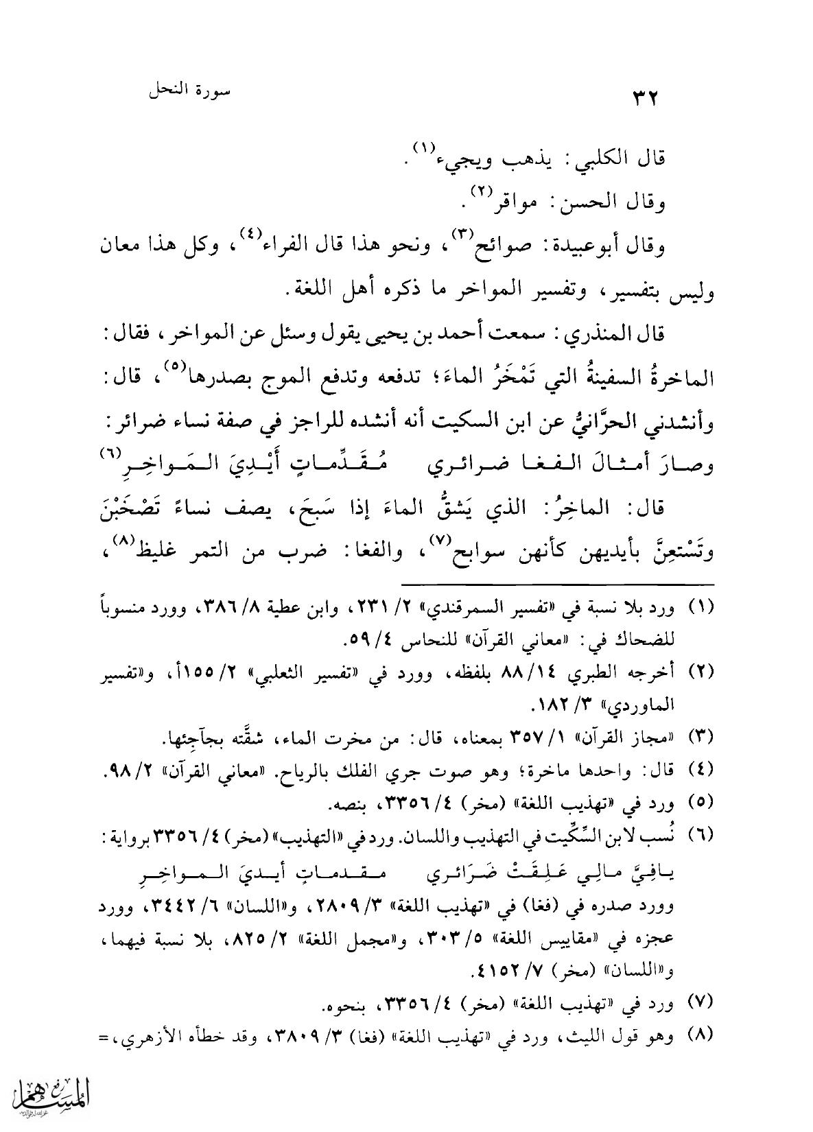 (¬6) نُسب لابن السِّكِّيت في التهذيب واللسان. ورد في "التهذيب" (مخر) 4/ 3356 برواية: