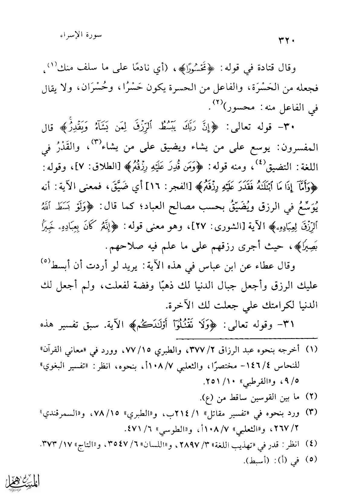 وقال قتادة في قوله: {مَحْسُورًا}، (أي نادمًا على ما سلف منك (¬1)، فجعله من الحَسْرَة، والفاعل من الحسرة يكون حَسْرُا، وحُسْرَان، ولا يقال في الفاعل منه: محسور) (¬2).