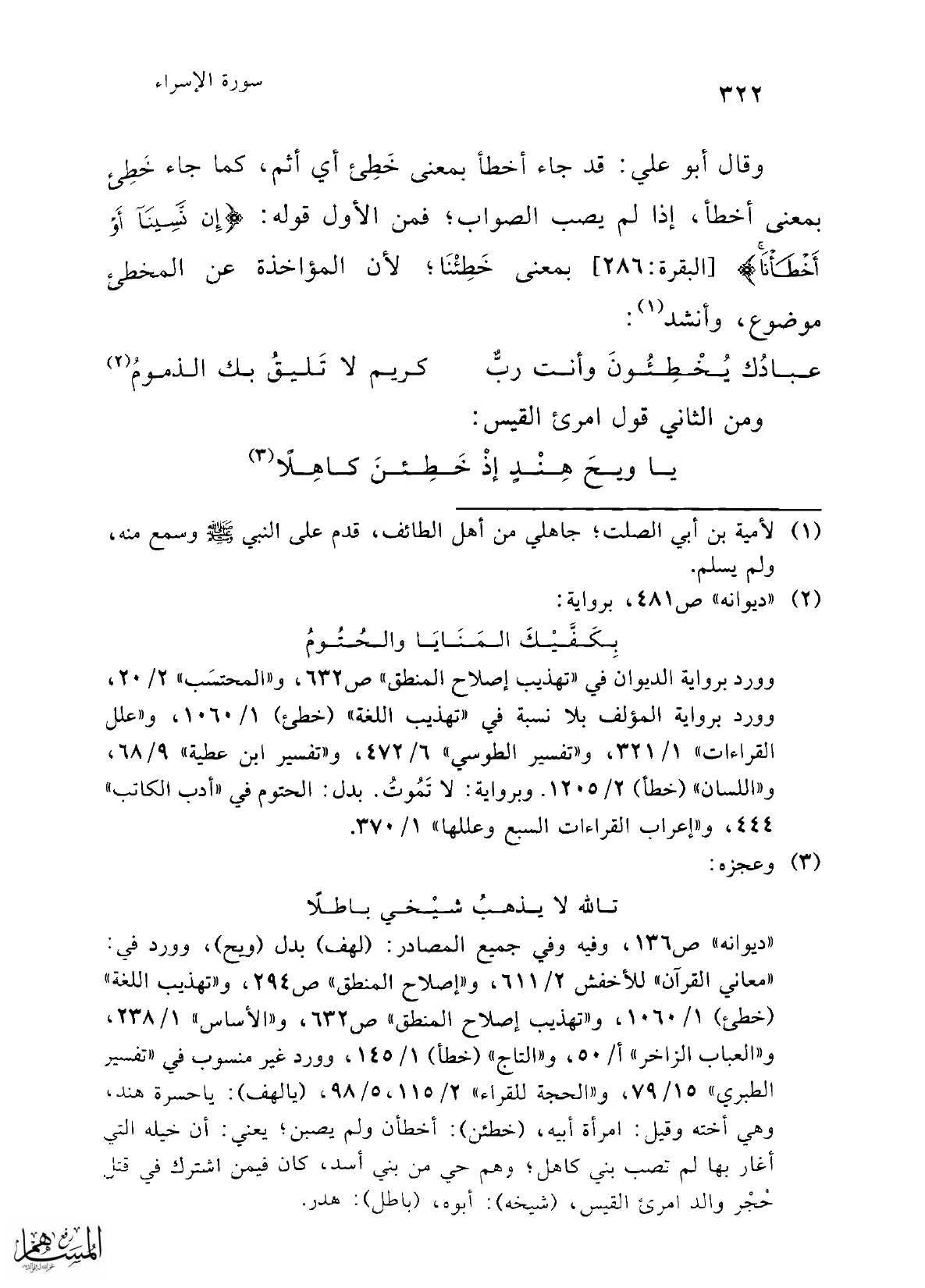 وقال أبو علي: قد جاء أخطأ بمعنى خَطِئ أي أثم، كما جاء خَطِئ بمعنى أخطأ، إذا لم يصب الصواب؛ فمن الأول قوله: {إِنْ نَسِينَا أَوْ أَخْطَأْنَا} [البقرة: 286] بمعنى خَطِئْنَا؛ لأن المؤاخذة عن المخطئ موضوع، وأنشد (¬1):