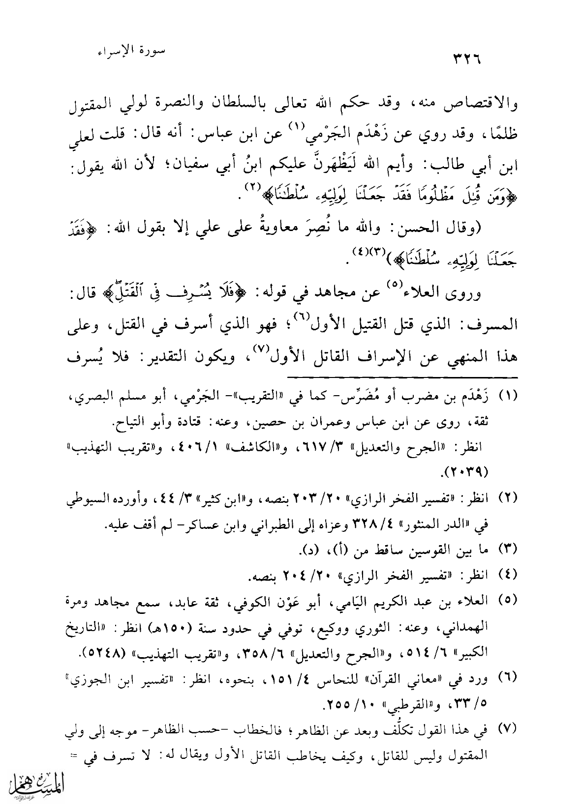 (¬7) في هذا القول تكلُّف وبعد عن الظاهر؛ فالخطاب -حسب الظاهر- موجه إلى ولي المقتول وليس للقاتل، وكيف يخاطب القاتل الأول ويقال له: لا تسرف في =