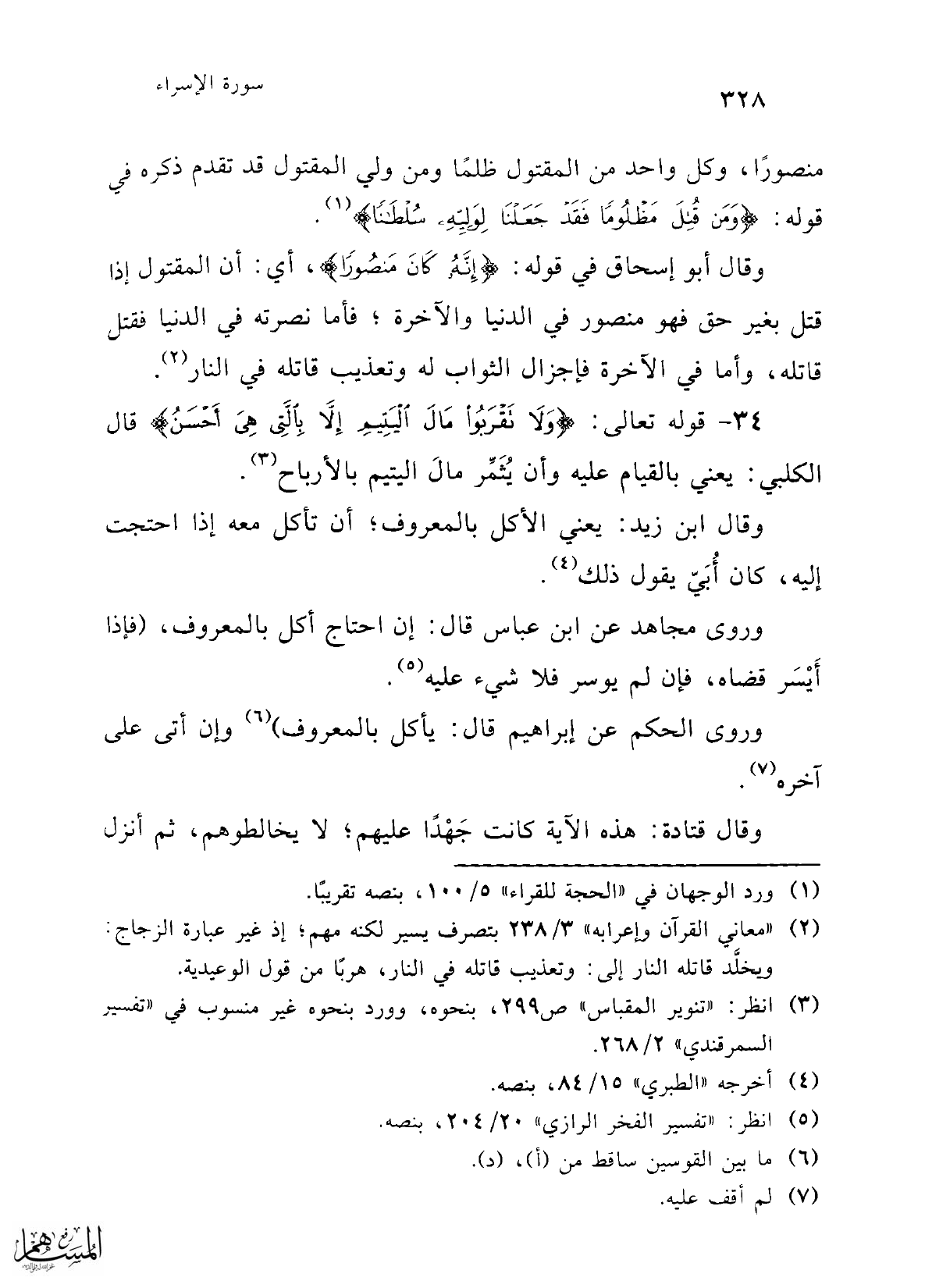 34 - قوله تعالى: {وَلَا تَقْرَبُوا مَالَ الْيَتِيمِ إِلَّا بِالَّتِي هِيَ أَحْسَنُ} قال الكلبي: يعني بالقيام عليه وأن يُثَمِّر مالَ اليتيم بالأرباح (¬3).