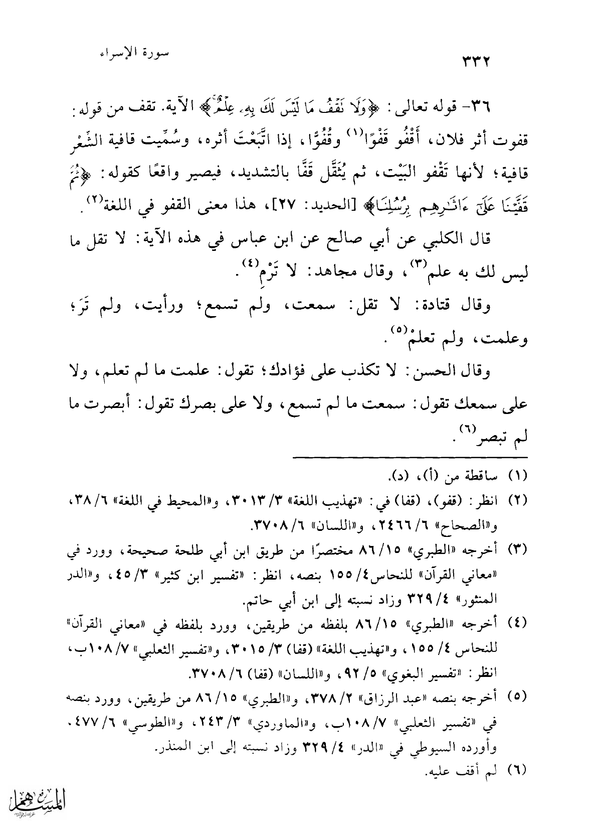 36 - قوله تعالى: {وَلَا تَقْفُ مَا لَيْسَ لَكَ بِهِ عِلْمٌ} الآية. تقف من قوله: قفوت أثر فلان، أَقْفُو قَفْوًا (¬1) وقُفُوًّا، إذا اتَّبَعْتَ أثره، وسُمِّيت قافية الشِّعْر قافية؛ لأنها تَقْفو البَيْت، ثم يُثَقَّل قَفَّا بالتشديد، فيصير واقعًا كقوله: {ثُمَّ قَفَّيْنَا عَلَى آثَارِهِمْ بِرُسُلِنَا} [الحديد: 27]، هذا معنى القفو في اللغة (¬2).