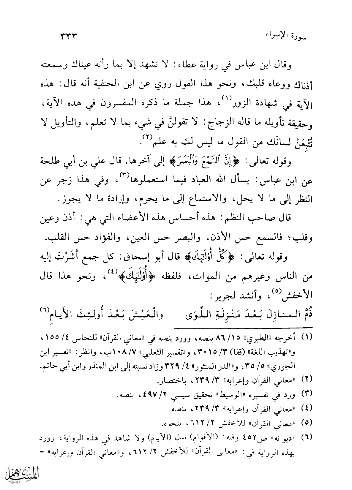 وقوله تعالى: {إِنَّ السَّمْعَ وَالْبَصَرَ} إلى آخرها. قال علي بن أبي طلحة عن ابن عباس: يسأل الله العباد فيما استعملوها (¬3)، وفي هذا زجر عن النظر إلى ما لا يحل، والاستماع إلى ما يحرم، وإرادة ما لا يجوز.