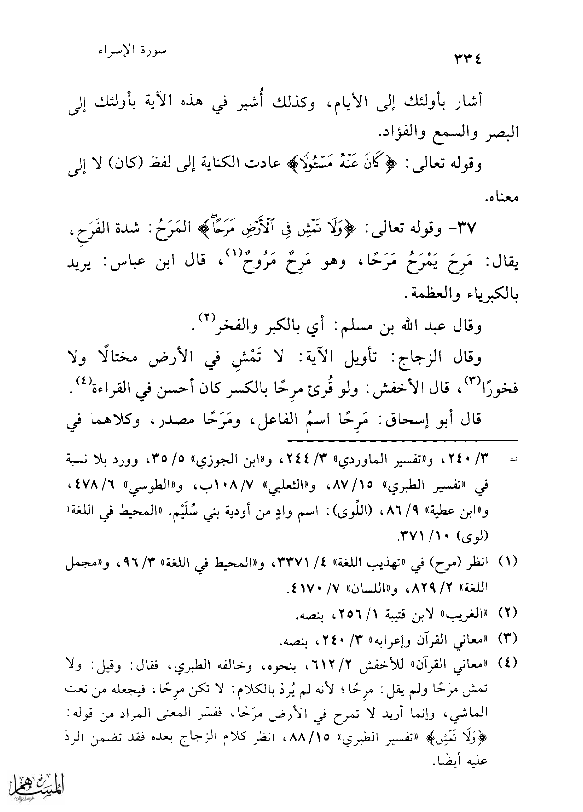 (¬4) "معاني القرآن" للأخفش 2/ 612، بنحوه، وخالفه الطبري، فقال: وقيل: ولا تمش مرَحًا ولم يقل: مرِحًا؛ لأنه لم يُردْ بالكلام: لا تكن مرِحًا، فيجعله من نعت الماشي، وإنما أريد لا تمرح في الأرض مرَحًا، ففسّر المعنى المراد من قوله: {وَلَا تَمْشِ} "تفسير الطبري" 15/ 88، انظر كلام الزجاج بعده فقد تضمن الردّ عليه أيضًا.