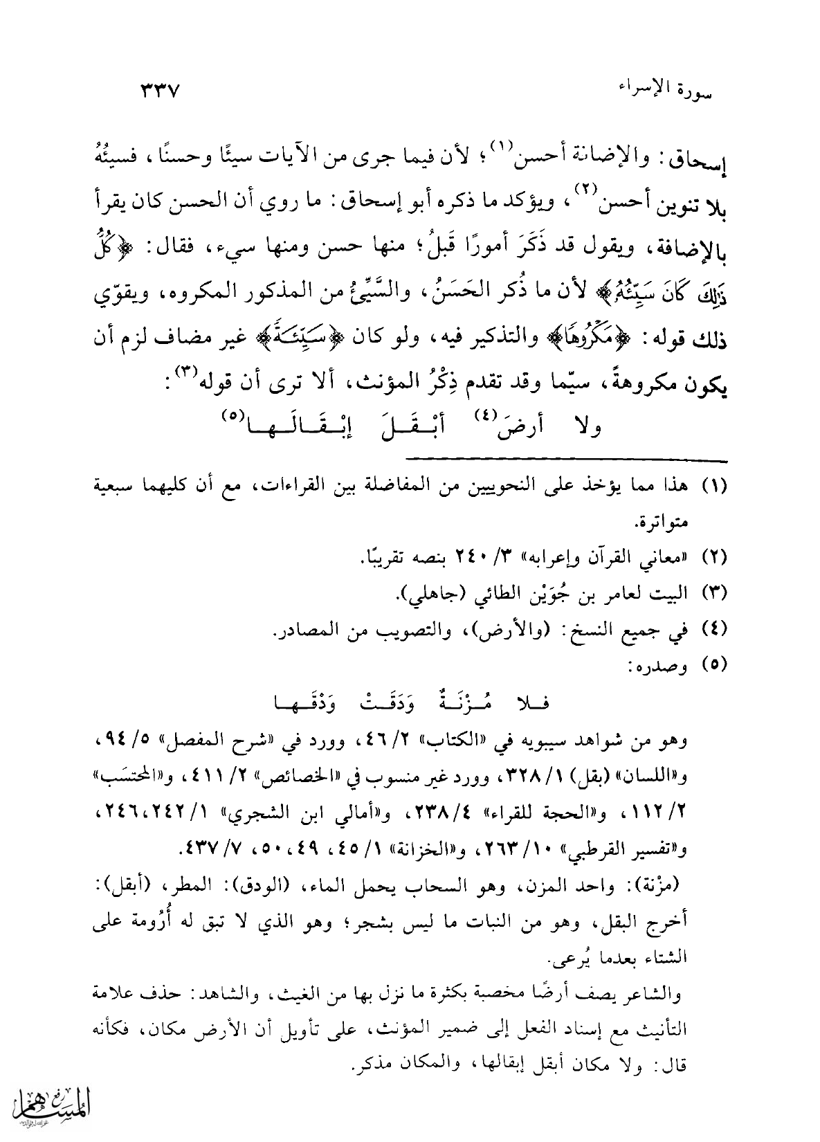 إسحاق: والإضافة أحسن (¬1)؛ لأن فيما جرى من الآيات سيئًا وحسنًا، فسيئُهُ بلا تنوين أحسن (¬2)، ويؤكد ما ذكره أبو إسحاق: ما روي أن الحسن كان يقرأ بالإضافة، ويقول قد ذَكَرَ أمورًا قَبلُ؛ منها حسن ومنها سيء، فقال: {كُلُّ ذَلِكَ كَانَ سَيِّئُهُ} لأن ما ذُكر الحَسَنُ، والسَّيِّئُ من المذكور المكروه، ويقوّي ذلك قوله: {مَكْرُوهًا} والتذكير فيه، ولو كان {سَيِّئَةً} غير مضاف لزم أن يكون مكروهةً، سيّما وقد تقدم ذِكْرُ المؤنث، ألا ترى أن قوله (¬3):