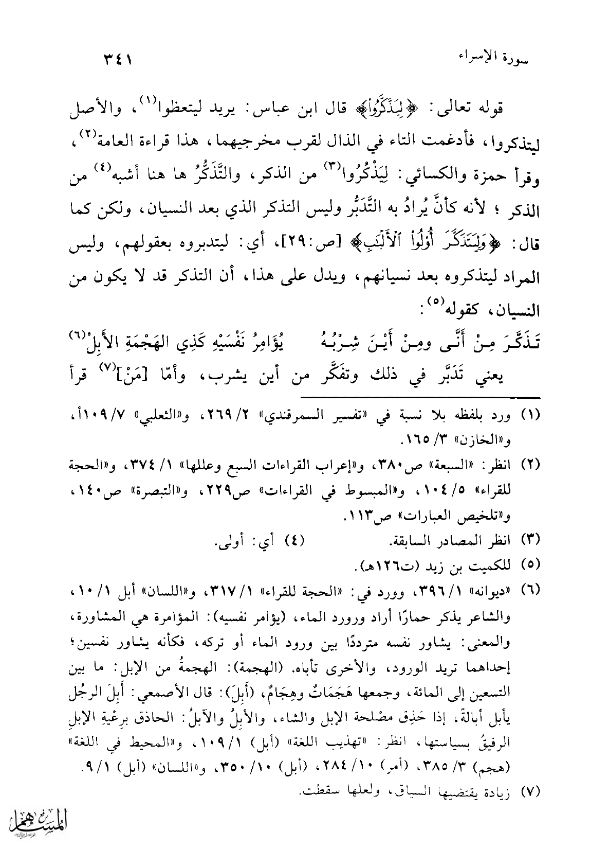 (¬6) "ديوانه" 1/ 396، وورد في: "الحجة للقراء" 1/ 317، و"اللسان" أبل 1/ 10، والشاعر يذكر حمارًا أراد ورورد الماء، (يؤامر نفسيه): المؤامرة هي المشاورة، والمعنى: يشاور نفسه مترددًا بين ورود الماء أو تركه، فكأنه يشاور نفسين؛ إحداهما تريد الورود، والأخرى تأباه. (الهجمة): الهجمةُ من الإبل: ما بين التسعين إلى المائة، وجمعها هَجَمَاتٌ وهِجَامٌ، (أَبِلَ): قال الأصمعي: أَبِلَ الرجُل يأبل أبالةً، إذا حَذِق مصْلحة الإبل والشاء، والأبِلُ والآبلُ: الحاذق برِعْيةِ الإبلِ الرفيقُ بسياستها، انظر: "تهذيب اللغة" (أبل) 1/ 109، و"المحيط في اللغة" (هجم) 3/ 385، (أمر) 10/ 284، (أبل) 10/ 350، و"اللسان" (أبل) 1/ 9.