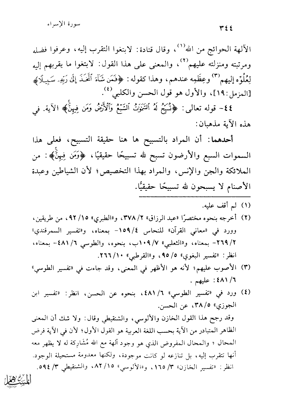 44 - قوله تعالى: {تُسَبِّحُ لَهُ السَّمَاوَاتُ السَّبْعُ وَالْأَرْضُ وَمَنْ فِيهِنَّ} الآية. في هذه الآية مذهبان:
