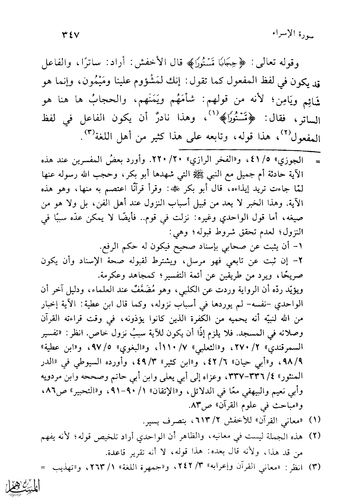 = الجوزي" 5/ 41، و"الفخر الرازي" 20/ 220. وأورد بعضُ المفسرين عند هذه الآية حادثة أم جميل مع النبي -صلى الله عليه وسلم- التي شهدها أبو بكر، وحجب الله رسوله عنها لما جاءت تريد إيذاءه، قال أبو بكر -رضي الله عنه-: وقرأ قرآنًا اعتصم به منها، وهو هذه الآية. وهذا الخبر لا يعد من قبيل أسباب النزول عند أهل الفن، بل ولا هو من صيغه، أما قول الواحدي وغيره: نزلت في قوم .. فأيضًا لا يمكن عدّه سببًا في النزول؛ لعدم تحقق شروط قبوله؛ وهي: