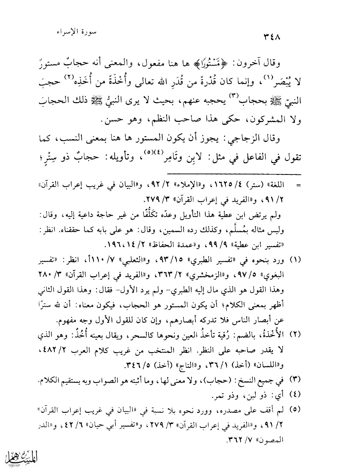 (¬1) ورد بنحوه في "تفسير الطبري" 93/ 15، و"الثعلبي" 7/ 110 أ، انظر: "تفسير البغوي" 5/ 97، و"الزمخشري" 2/ 363، و"الفريد في إعراب القرآن" 3/ 280 وهذا القول هو الذي مال إليه الطبري -ولم يرد الأول- فقال: وهذا القول الثاني أظهر بمعنى الكلام؛ أن يكون المستور هو الحجاب، فيكون معناه: أن لله سترًا عن أبصار الناس فلا تدركه أبصارهم، وإن كان للقول الأول وجه مفهوم.