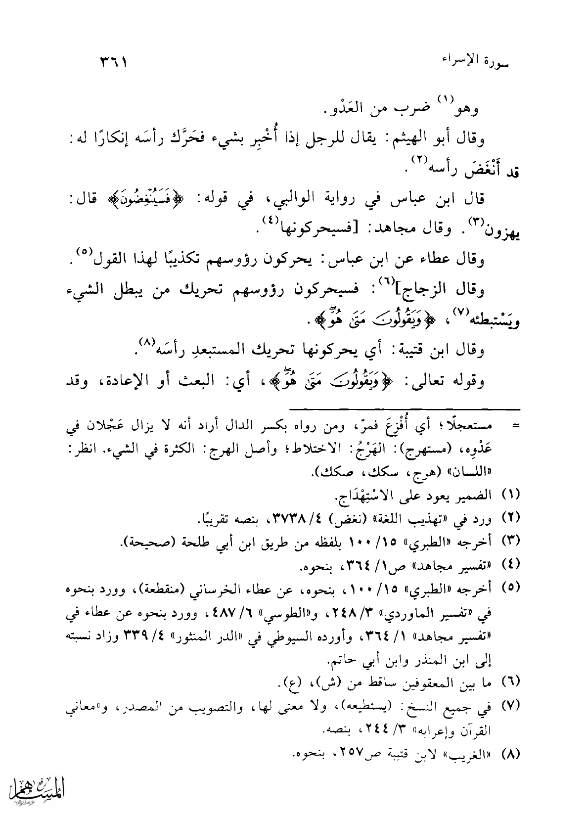 قال ابن عباس في رواية الوالبي، في قوله: {فَسَيُنْغِضُونَ} قال: يهزون (¬3). وقال مجا هد: [فسيحركونها (¬4).
