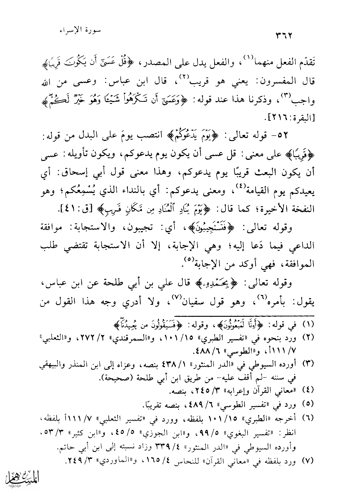 52 - قوله تعالى: {يَوْمَ يَدْعُوكُمْ} انتصب يومَ على البدل من قوله: {قَرِيبًا} على معنى: قل عسى أن يكون يوم يدعوكم، ويكون تأويله: عسى أن يكون البعث قريبًا يوم يدعوكم، وهذا معنى قول أبي إسحاق: أي يعيدكم يوم القيامة (¬4)، ومعنى يدعوكم: أي بالنداء الذي يُسْمِعكم، وهو النفخة الأخيرة؛ كما قال: {يَوْمَ يُنَادِ الْمُنَادِ مِنْ مَكَانٍ قَرِيبٍ} [ق: 41].