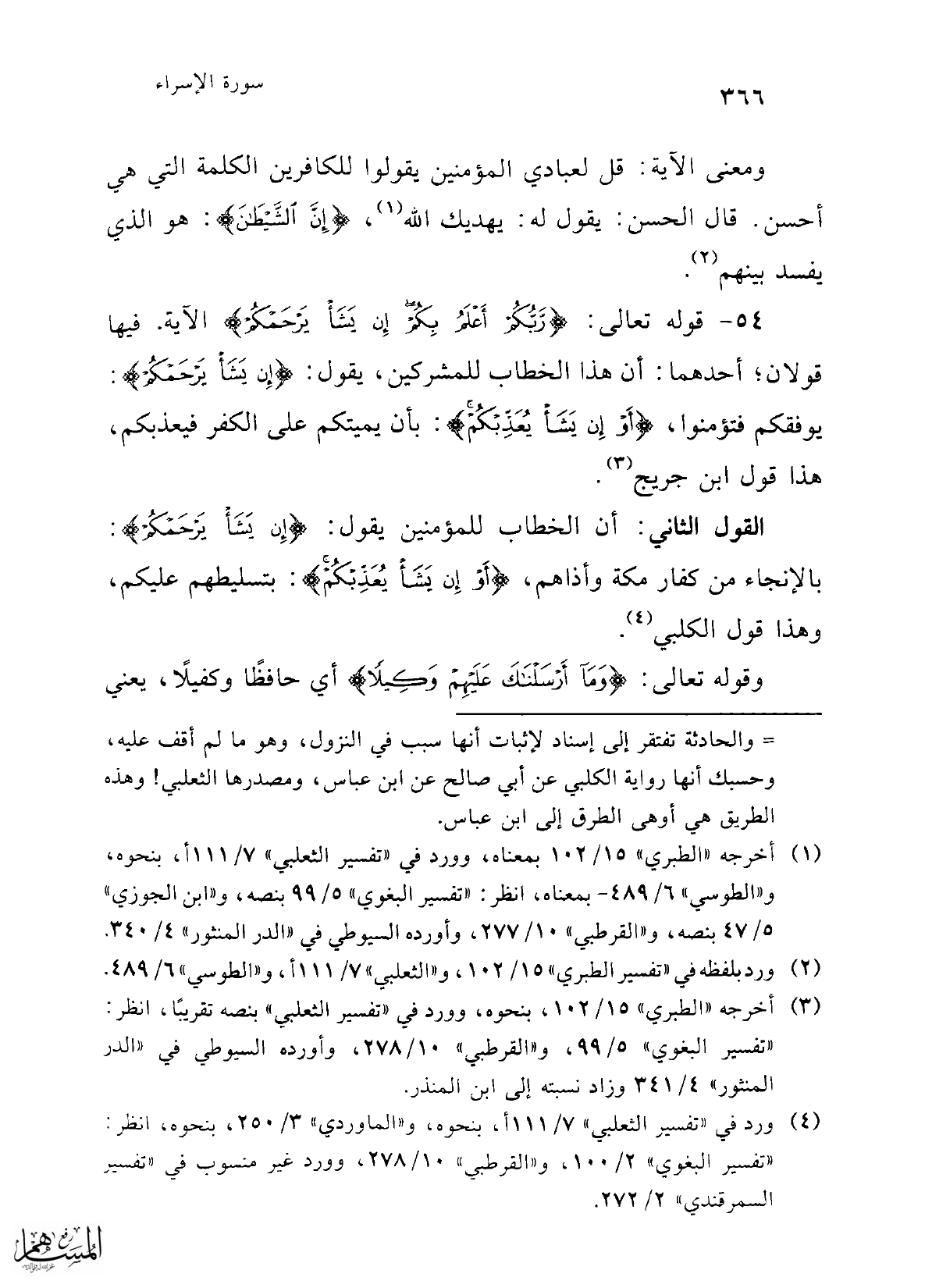 54 - قوله تعالى: {رَبُّكُمْ أَعْلَمُ بِكُمْ إِنْ يَشَأْ يَرْحَمْكُمْ} الآية. فيها قولان؛ أحدهما: أن هذا الخطاب للمشركين، يقول: {إِنْ يَشَأْ يَرْحَمْكُمْ}: يوفقكم فتؤمنوا، {أَوْ إِنْ يَشَأْ يُعَذِّبْكُمْ}: بأن يميتكم على الكفر فيعذبكم، هذا قول ابن جريج (¬3).