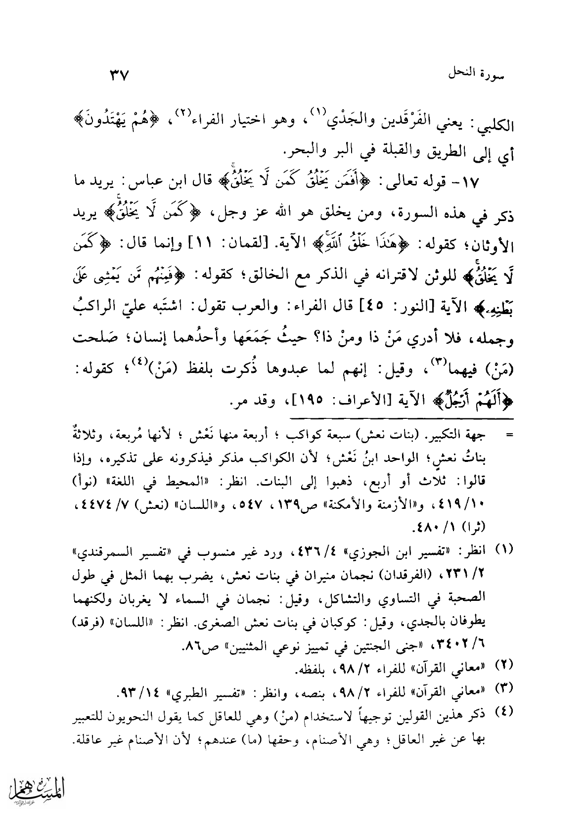 17 - قوله تعالى: {أَفَمَنْ يَخْلُقُ كَمَنْ لَا يَخْلُقُ} قال ابن عباس: يريد ما ذكر في هذه السورة، ومن يخلق هو الله عَزَّ وَجَلَّ، {كَمَنْ لَا يَخْلُقُ} يريد الأوثان؛ كقوله: {هَذَا خَلْقُ اللَّهِ} الآية. [لقمان: 11] وإنما قال: {كَمَنْ لَا يَخْلُقُ} للوثن لاقترانه في الذكر مع الخالق؛ كقوله: {فَمِنْهُمْ مَنْ يَمْشِي عَلَى بَطْنِهِ} الآية [النور: 45] قال الفراء: والعرب تقول: اشتَبه عليّ الراكبُ وجمله، فلا أدري مَنْ ذا ومنْ ذا؟ حيثُ جَمَعَها وأحدُهما إنسان؛ صَلحت (مَنْ) فيهما (¬3)، وقيل: إنهم لما عبدوها ذُكرت بلفظ (مَنْ) (¬4)؛ كقوله: {أَلَهُمْ أَرْجُلٌ} الآية [الأعراف: 195]، وقد مر.