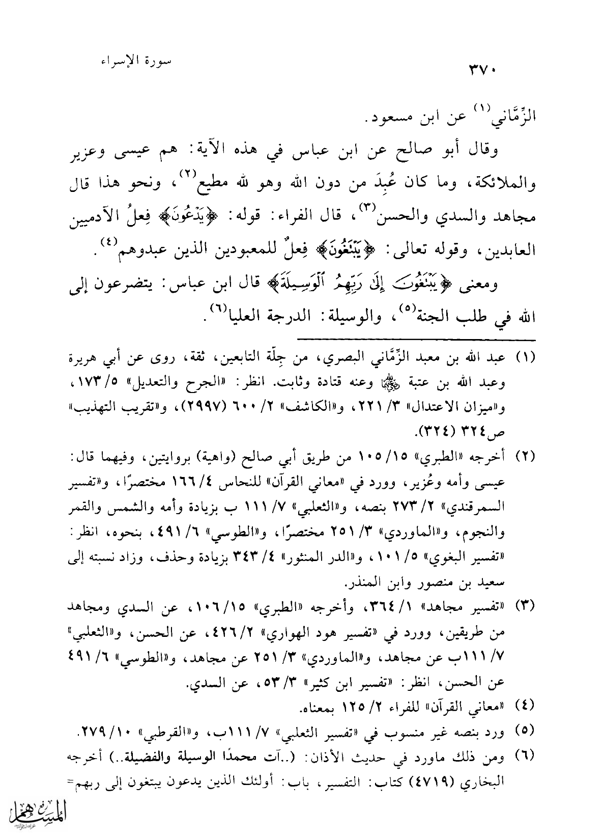 ومعنى {يَبْتَغُونَ إِلَى رَبِّهِمُ الْوَسِيلَةَ} قال ابن عباس: يتضرعون إلى الله في طلب الجنة (¬5)، والوسيلة: الدرجة العليا (¬6).