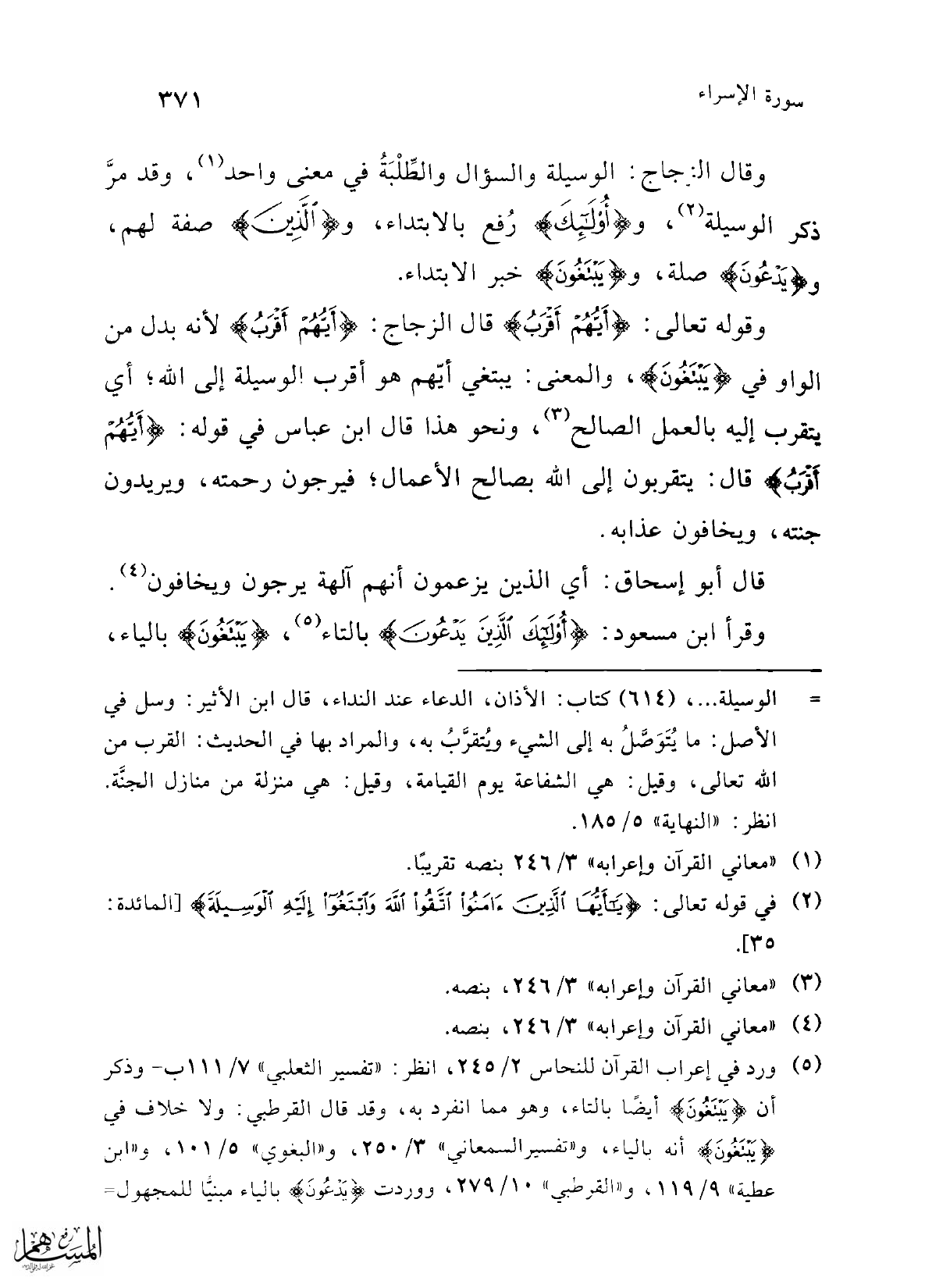 وقرأ ابن مسعود: {أُولَئِكَ الَّذِينَ يَدْعُونَ} بالتاء (¬5)، {يَبْتَغُونَ} بالياء،