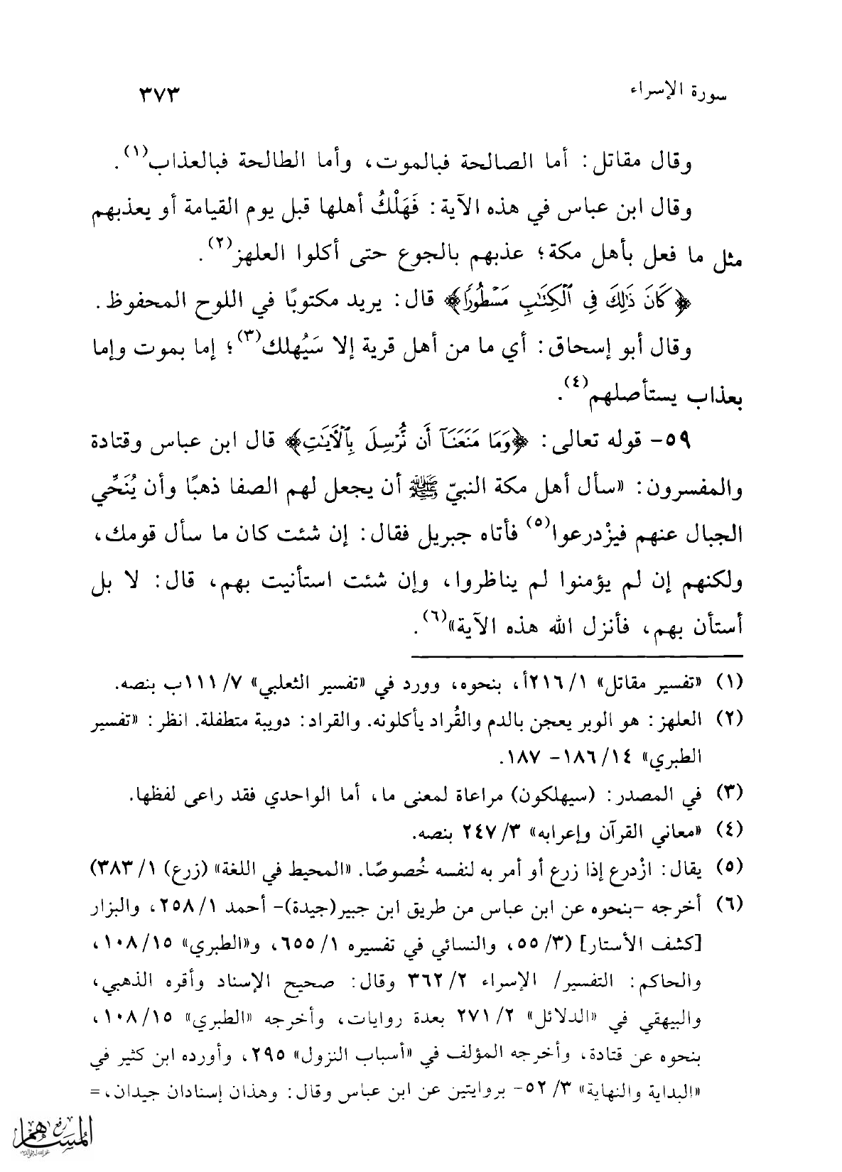 (¬6) أخرجه -بنحوه عن ابن عباس من طريق ابن جبير (جيدة) - أحمد 1/ 258، والبزار [كشف الأستار] (3/ 55، والنسائي في تفسيره 1/ 655، و"الطبري" 15/ 108، والحاكم: التفسير/الإسراء 2/ 362 وقال: صحيح الإسناد وأقره الذهبي، والبيهقي في "الدلائل" 2/ 271 بعدة روايات، وأخرجه "الطبري" 15/ 108، بنحوه عن قتادة، وأخرجه المؤلف في "أسباب النزول" 295، وأورده ابن كثير في "البداية والنهاية" 3/ 52 - بروايتين عن ابن عباس وقال: وهذان إسنادان جيدان،=