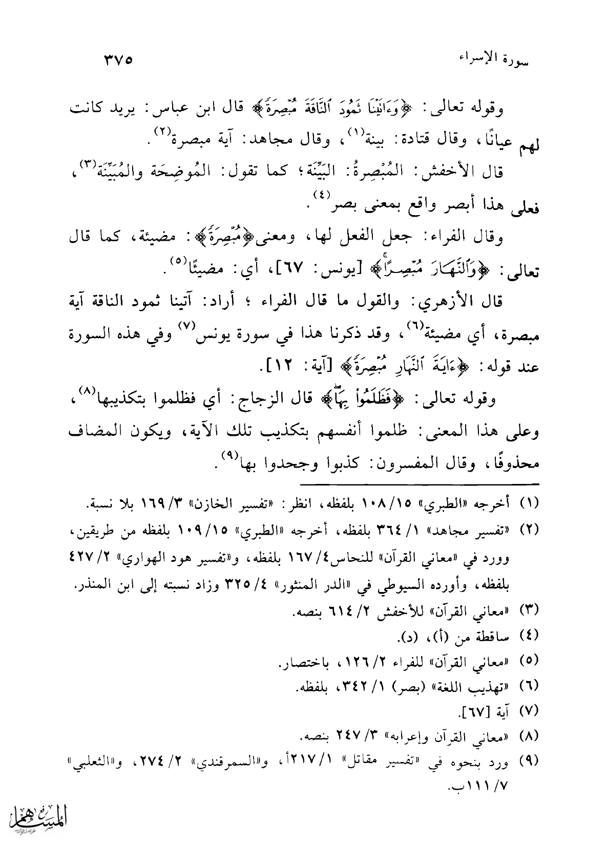 قال الأزهري: والقول ما قال الفراء؛ أراد: آتينا ثمود الناقة آية مبصرة، أي مضيئة (¬6)، وقد ذكرنا هذا في سورة يونس (¬7) وفي هذه السورة عند قوله: {آيَةَ النَّهَارِ مُبْصِرَةً} [آية: 12].