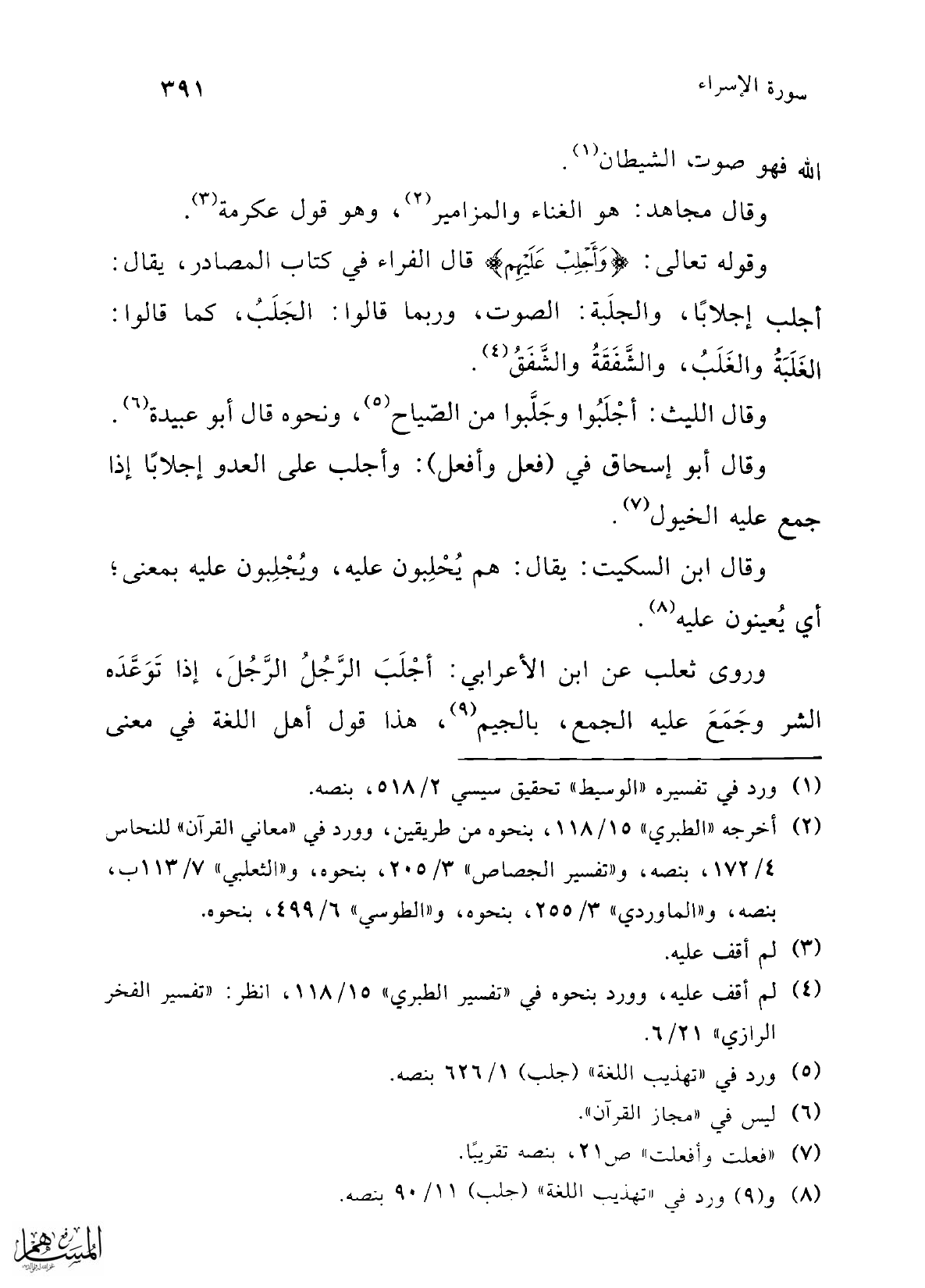 وقوله تعالى: {وَأَجْلِبْ عَلَيْهِمْ} قال الفراء في كتاب المصادر، يقال: أجلب إجلابًا، والجلَبة: الصوت، وربما قالوا: الجَلَبُ، كما قالوا: الغَلَبَةُ والغَلَبُ، والشَّفَقَةُ والشَّفَقُ (4).