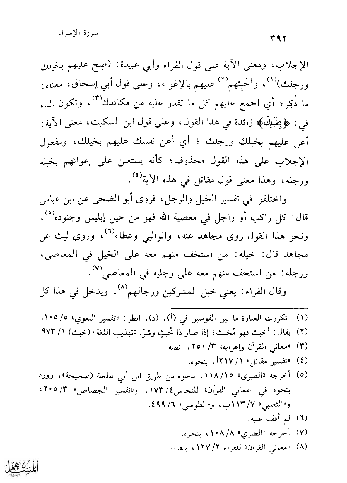 الإجلاب، ومعنى الآية على قول الفراء وأبي عبيدة: (صِح عليهم بخيلك ورجلك) (¬1)، وأخْبِثهم (¬2) عليهم بالإغواء، وعلى قول أبي إسحاق، معناه. ما ذُكِر؛ أي اجمع عليهم كل ما تقدر عليه من مكائدك (¬3)، وتكون الباء في: {بِخَيْلِكَ} زائدة في هذا القول، وعلى قول ابن السكيت، معنى الآية: أعن عليهم بخيلك ورجلك؛ أي أعن نفسك عليهم بخيلك، ومفعول الإجلاب على هذا القول محذوف؛ كأنه يستعين على إغوائهم بخيله ورجله، وهذا معنى قول مقاتل في هذه الآية (¬4).