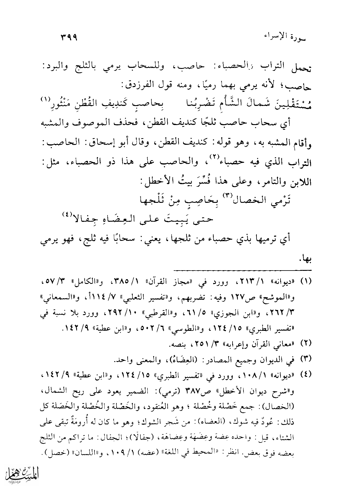 (¬4) "ديوانه" 1/ 108، وورد في "تفسير الطبري" 15/ 124، و"ابن عطية" 9/ 142، و"شرح ديوان الأخطل" ص 387 (ترمي): الضمير يعود على ريح الشمال، (الخصال): جمع خَصْلة وخُصْلة؛ وهو العُنقود، والخَصْلة والخُصْلة والخَصَلة كل ذلك: عُودٌ فيه شوك , (العضاه): من شَجر الشوك؛ وهو ما كان له أُرومَةٌ تبقى على الشتاء، قيل: واحده عضة وعِضَهةَ وعِضاهَة، (جفالاً)؛ الجفال: ما تراكم من الثلج بعضه فوق بعض. انظر: "المحيط في اللغة" (عضه) 1/ 109، و"اللسان" (خصل).