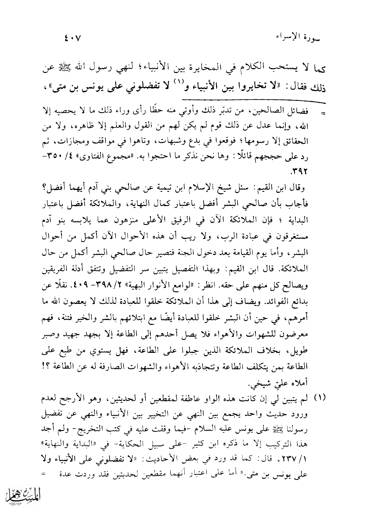 كما لا يستحب الكلام في المخايرة بين الأنبياء؛ لنهي رسول الله -صلى الله عليه وسلم- عن ذلك فقال: "لا تخايروا بين الأنبياء و (¬1) لا تفضلوني على يونس بن متى"،