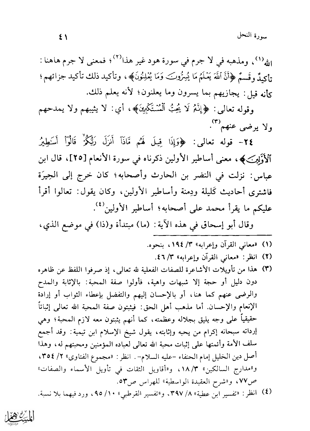الله (¬1)، ومذهبه في لا جرم في سورة هود غير هذا (¬2)؛ فمعنى لا جرم هاهنا: تأكيدٌ وقَسمٌ {أَنَّ اللَّهَ يَعْلَمُ مَا يُسِرُّونَ وَمَا يُعْلِنُونَ}، وتأكيد ذلك تأكيد جزائهم؛ كأنه قيل: يجازيهم بما يسرون وما يعلنون؛ لأنه يعلم ذلك.