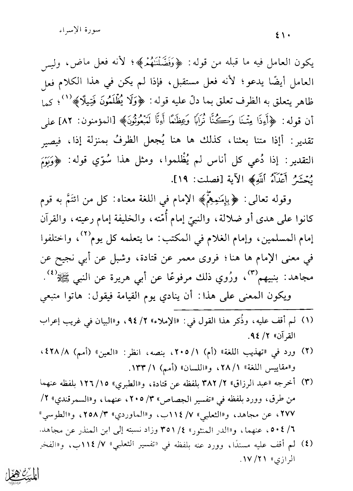 وقوله تعالى: {بِإِمَامِهِمْ} الإمام في اللغة معناه: كل من ائتَمَّ به قوم كانوا على هدى أو ضلالة، والنبيّ إمام أُمّته، والخليفة إمام رعيته، والقرآن إمام المسلمين، وإمام الغلام في المكتب: ما يتعلمه كل يوم (¬2)، واختلفوا في معنى الإمام هاهنا، فروى معمر عن قتادة، وشبل عن أبي نجيح عن مجاهد: بنبيهم (¬3)، ورُوي ذلك مرفوعًا عن أبي هريرة عن النبي -صلى الله عليه وسلم- (¬4).