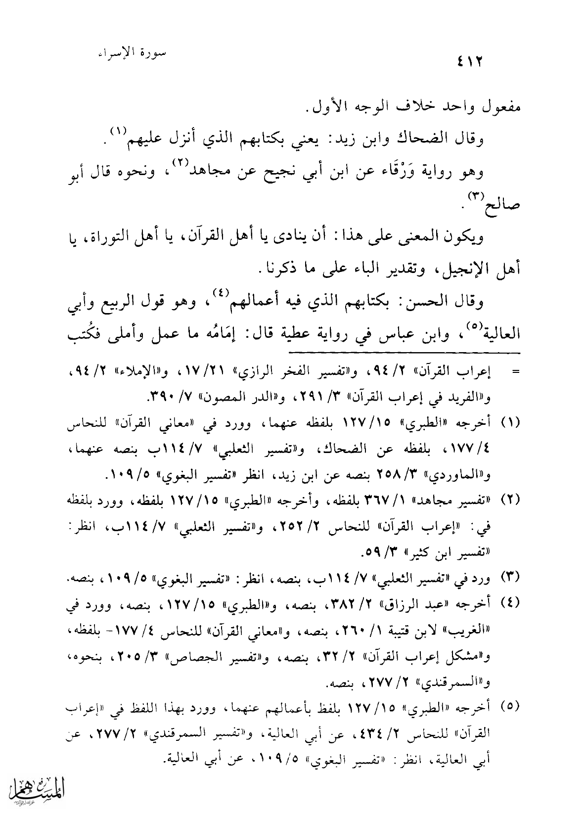 = إعراب القرآن" 2/ 94، و"تفسير الفخر الرازي" 21/ 17، و"الإملاء" 2/ 94، و"الفريد في إعراب القرآن" 3/ 291، و"الدر المصون" 7/ 390.