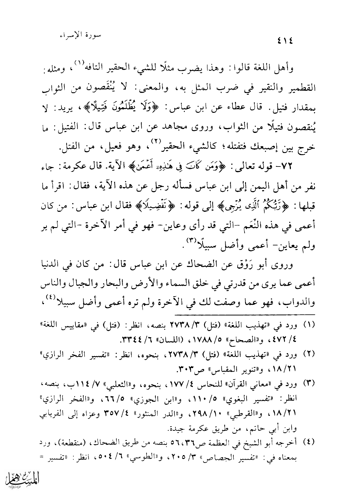 وأهل اللغة قالوا: وهذا يضرب مثلًا للشيء الحقير التافه (¬1)، ومثله: القطمير والنقير في ضرب المثل به، والمعنى: لا يُنْقَصون من الثواب بمقدار فتيل. قال عطاء عن ابن عباس: {وَلَا يُظْلَمُونَ فَتِيلًا}، يريد. لا يُنقصون فتيلًا من الثواب، وروى مجاهد عن ابن عباس قال: الفتيل: ما خرج بين إصبعك فتفتله؛ كالشيء الحقير (¬2)، وهو فعيل، من الفتل.