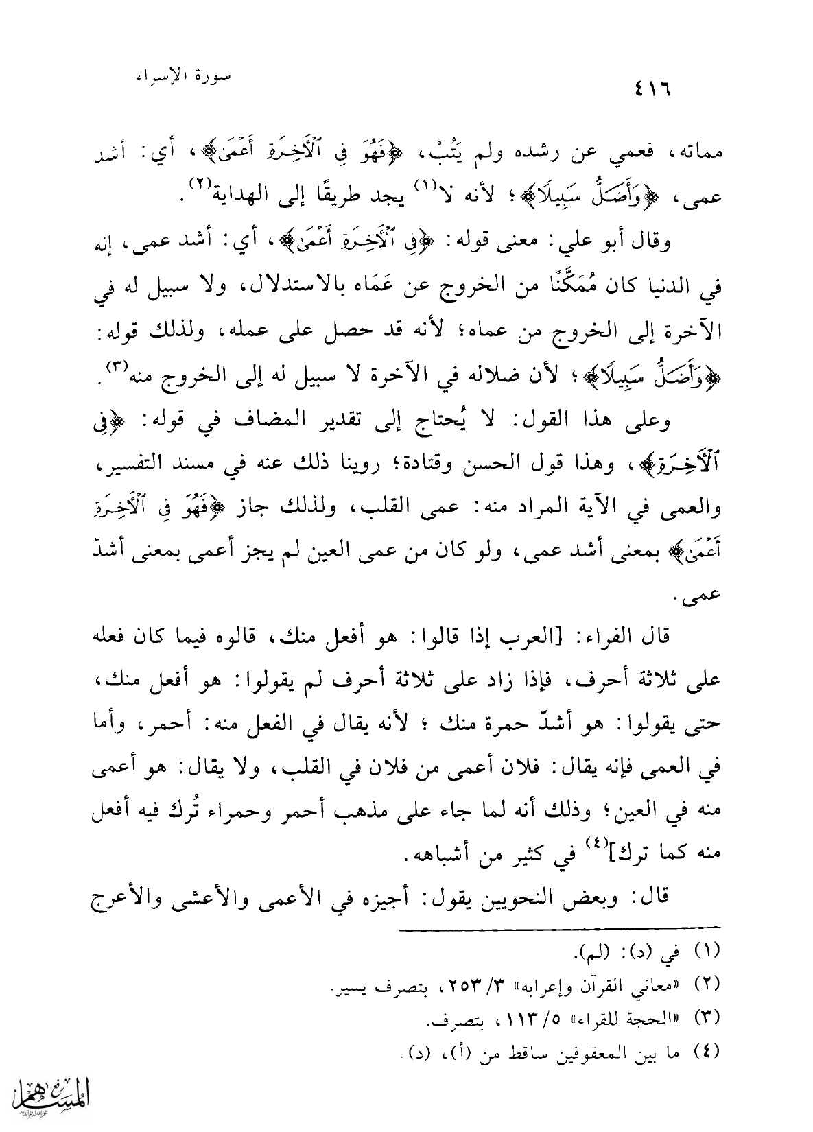 وقال أبو علي: معنى قوله: {فِي الْآخِرَةِ أَعْمَى}، أي: أشد عمى، إنه في الدنيا كان مُمَكَّنًا من الخروج عن عَمَاه بالاستدلال، ولا سبيل له في الآخرة إلى الخروج من عماه؛ لأنه قد حصل على عمله، ولذلك قوله: {وَأَضَلُّ سَبِيلًا}؛ لأن ضلاله في الآخرة لا سبيل له إلى الخروج منه (¬3).