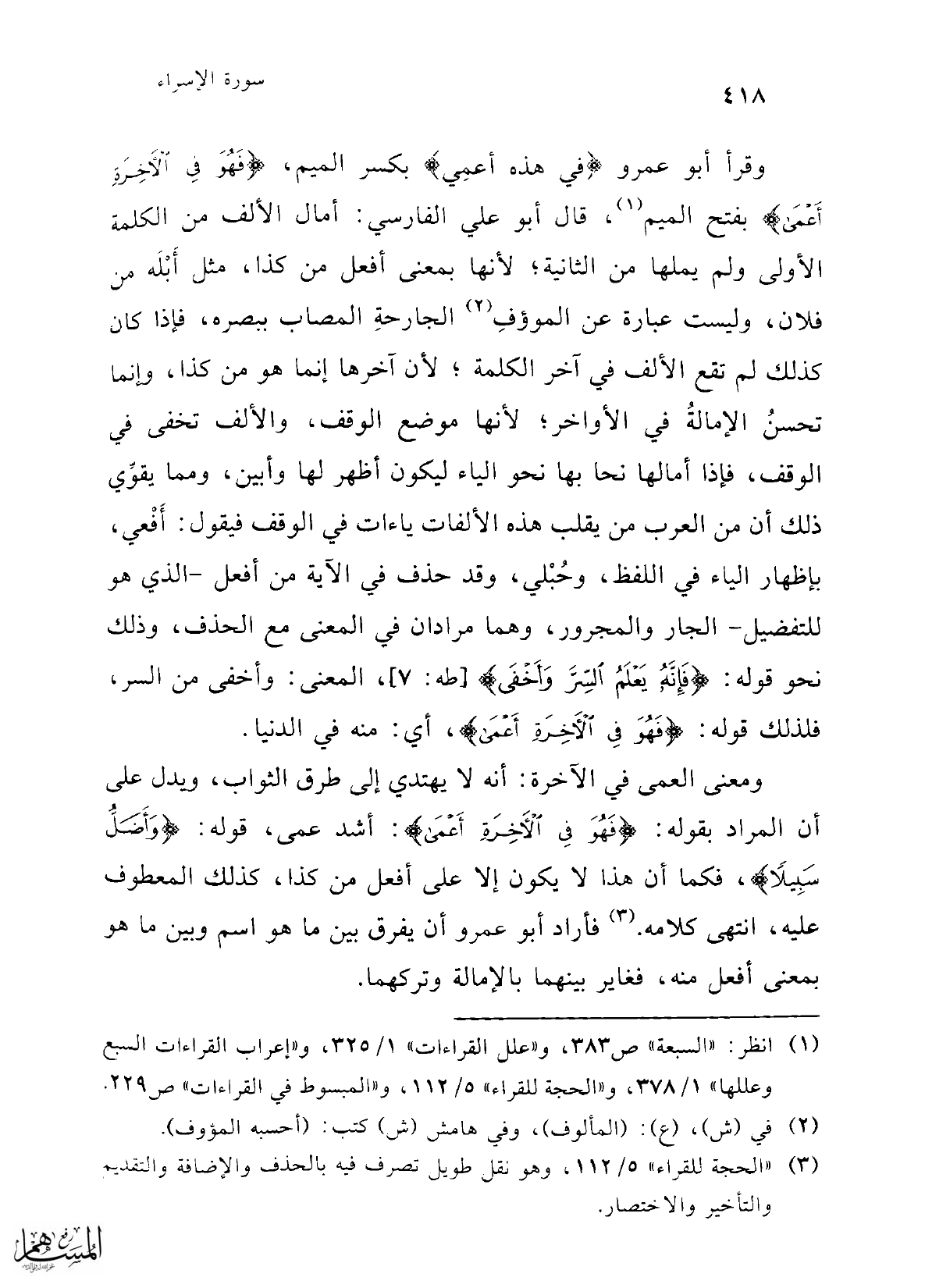 ومعنى العمى في الآخرة: أنه لا يهتدي إلى طرق الثواب، ويدل على أن المراد بقوله: {فَهُوَ فِي الْآخِرَةِ أَعْمَى}: أشد عمى، قوله: {وَأَضَلُّ سَبِيلًا} فكما أن هذا لا يكون إلا على أفعل من كذا، كذلك المعطوف عليه، انتهى كلامه. (¬3) فأراد أبو عمرو أن يفرق بين ما هو اسم وبين ما هو بمعنى أفعل منه، فغاير بينهما بالإمالة وتركهما.