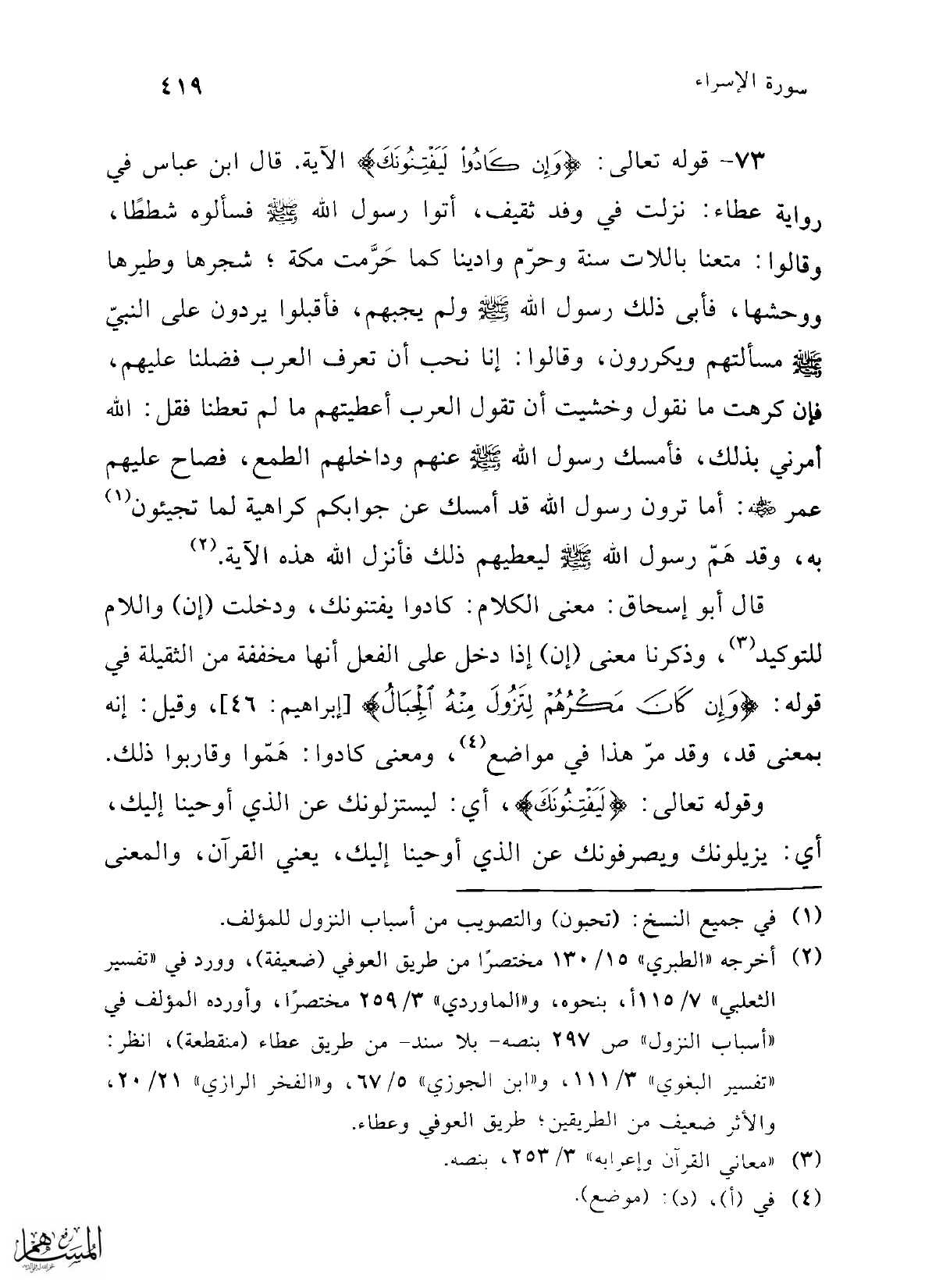 73 - قوله تعالى: {وَإِنْ كَادُوا لَيَفْتِنُونَكَ} الآية. قال ابن عباس في رواية عطاء: نزلت في وفد ثقيف، أتوا رسول الله -صلى الله عليه وسلم- فسألوه شططًا، وقالوا: متعنا باللات سنة وحرّم وادينا كما حَرَّمت مكة، شجرها وطيرها ووحشها، فأبى ذلك رسول الله -صلى الله عليه وسلم- ولم يجبهم، فأقبلوا يردون على النبيّ -صلى الله عليه وسلم- مسألتهم ويكررون، وقالوا: إنا نحب أن تعرف العرب فضلنا عليهم، فإن كرهت ما نقول وخشيت أن تقول العرب أعطيتهم ما لم تعطنا فقل: الله أمرني بذلك، فأمسك رسول الله -صلى الله عليه وسلم- عنهم وداخلهم الطمع، فصاح عليهم عمر -رضي الله عنه-: أما ترون رسول الله قد أمسك عن جوابكم كراهية لما تجيئون (¬1) به، وقد هَمّ رسول الله -صلى الله عليه وسلم- ليعطيهم ذلك فأنزل الله هذه الآية. (¬2)