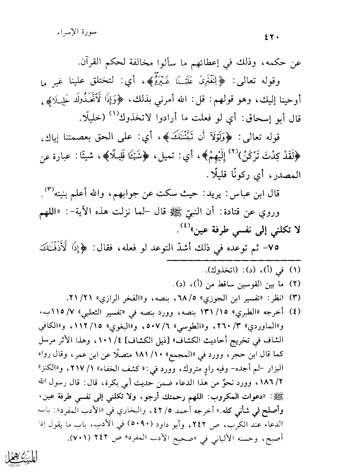 وروي عن قتادة: أن النبيّ -صلى الله عليه وسلم- قال -لما نزلت هذه الآية-: "اللهم لا تكلني إلى نفسي طرفة عين" (¬4).