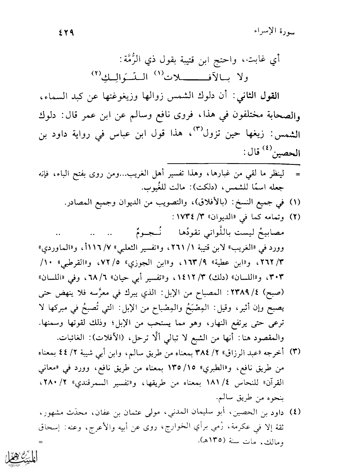 وورد في "الغريب" لابن قتيبة 1/ 261، و"تفسير الثعلبي" 7/ 116 أ، و"الماوردي" 3/ 262، و"ابن عطية" 9/ 163، و"ابن الجوزي" 5/ 72، و"القرطبي" 10/ 303، و"اللسان" (دلك) 3/ 1412، و"تفسير أبي حيان" 6/ 68، وفي "اللسان" (صبح) 4/ 2389: المصباح من الإبل: الذي يبرك في معرَّسه فلا ينهض حتى يصبح وإن أثير، وقيل: المِصْبَحُ والمِصْباح من الإبل: التي تُصبحُ في مبركها لا ترعى حتى يرتفع النهار، وهو مما يستحب من الإبل؛ وذلك لقوتها وسمنها. والمقصود هنا: أنها من الشبع لا تبالي ألَّا ترحل، (الآفلات): الغائبات.