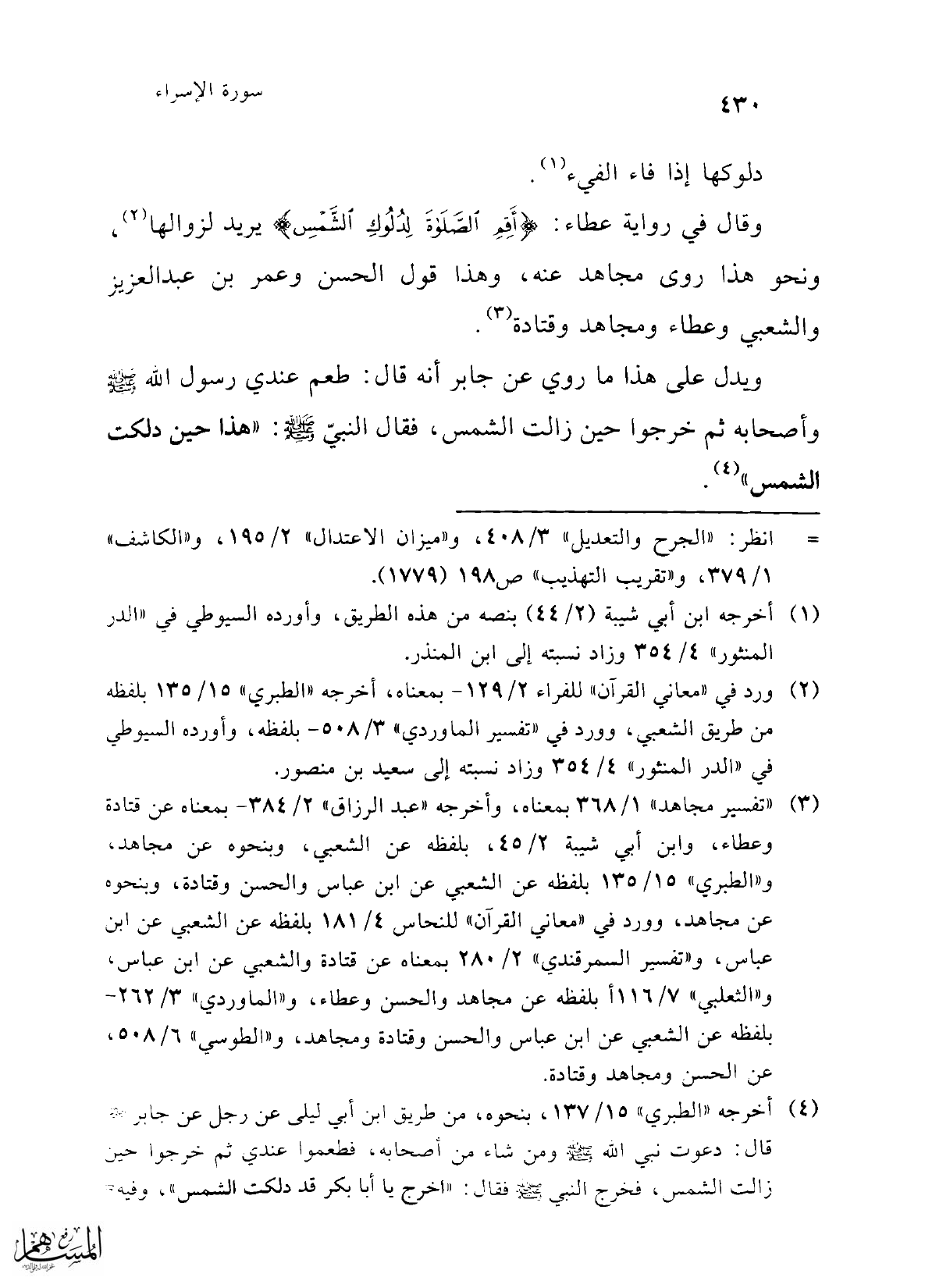 (¬4) أخرجه "الطبري" 15/ 137، بنحوه، من طريق ابن أبي ليلى عن رجل عن جابر -رضي الله عنه- قال: دعوت نبي الله -صلى الله عليه وسلم- ومن شاء من أصحابه، فطعموا عندي ثم خرجوا حين زالت الشمس، فخرج النبي -صلى الله عليه وسلم- فقال: "اخرج يا أبا بكر قد دلكت الشمس"، فيه=