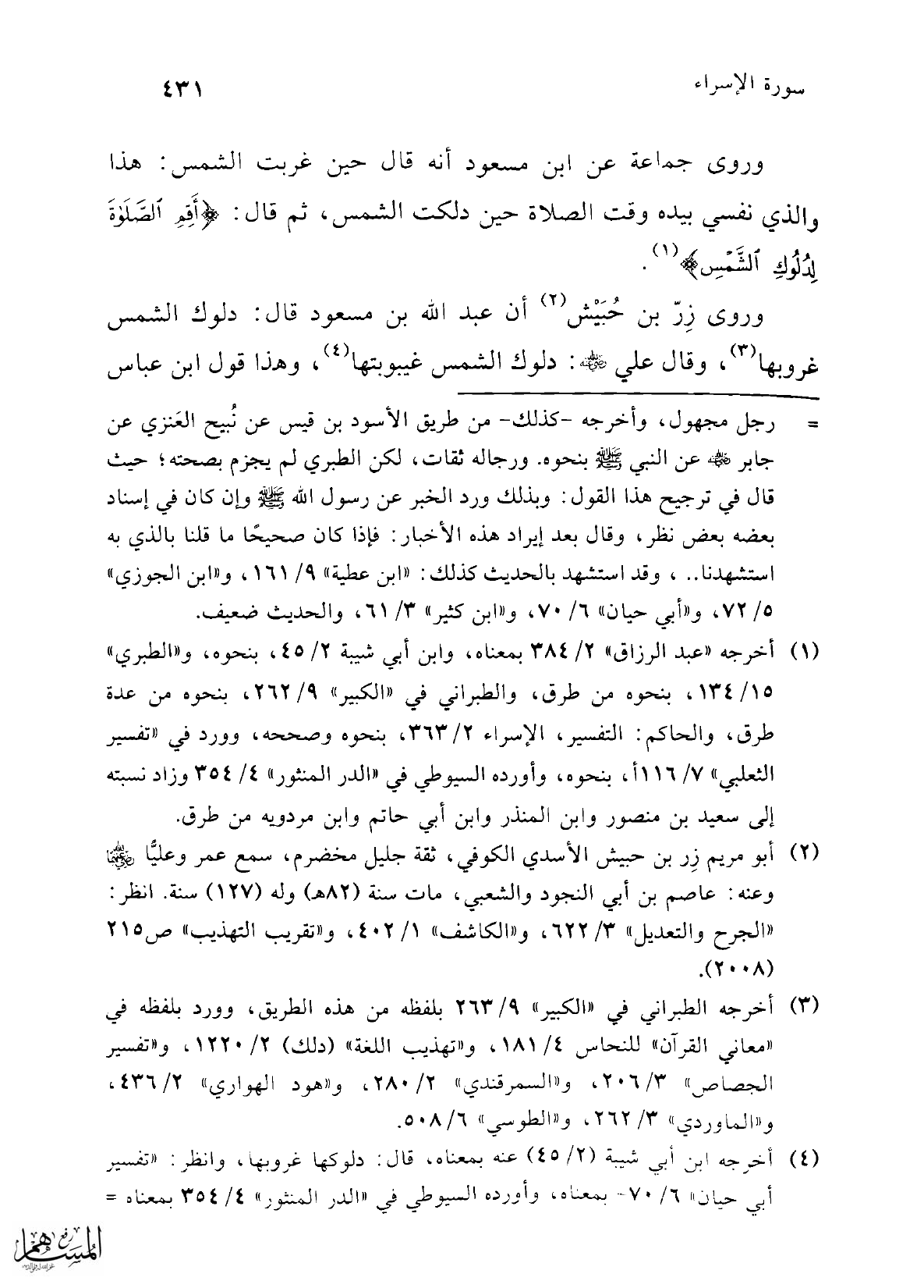 (¬1) أخرجه "عبد الرزاق" 2/ 384 بمعناه، وابن أبي شيبة 2/ 45، بنحوه، و"الطبري" 15/ 134، بنحوه من طرق، والطبراني في "الكبير" 9/ 262، بنحوه من عدة طرق، والحاكم: التفسير، الإسراء2/ 363، بنحوه وصححه، وورد في "تفسير الثعلبي" 7/ 116 أ، بنحوه، وأورده السيوطي في "الدر المنثور" 4/ 354 وزاد نسبته إلى سعيد بن منصور وابن المنذر وابن أبي حاتم وابن مردويه من طرق.