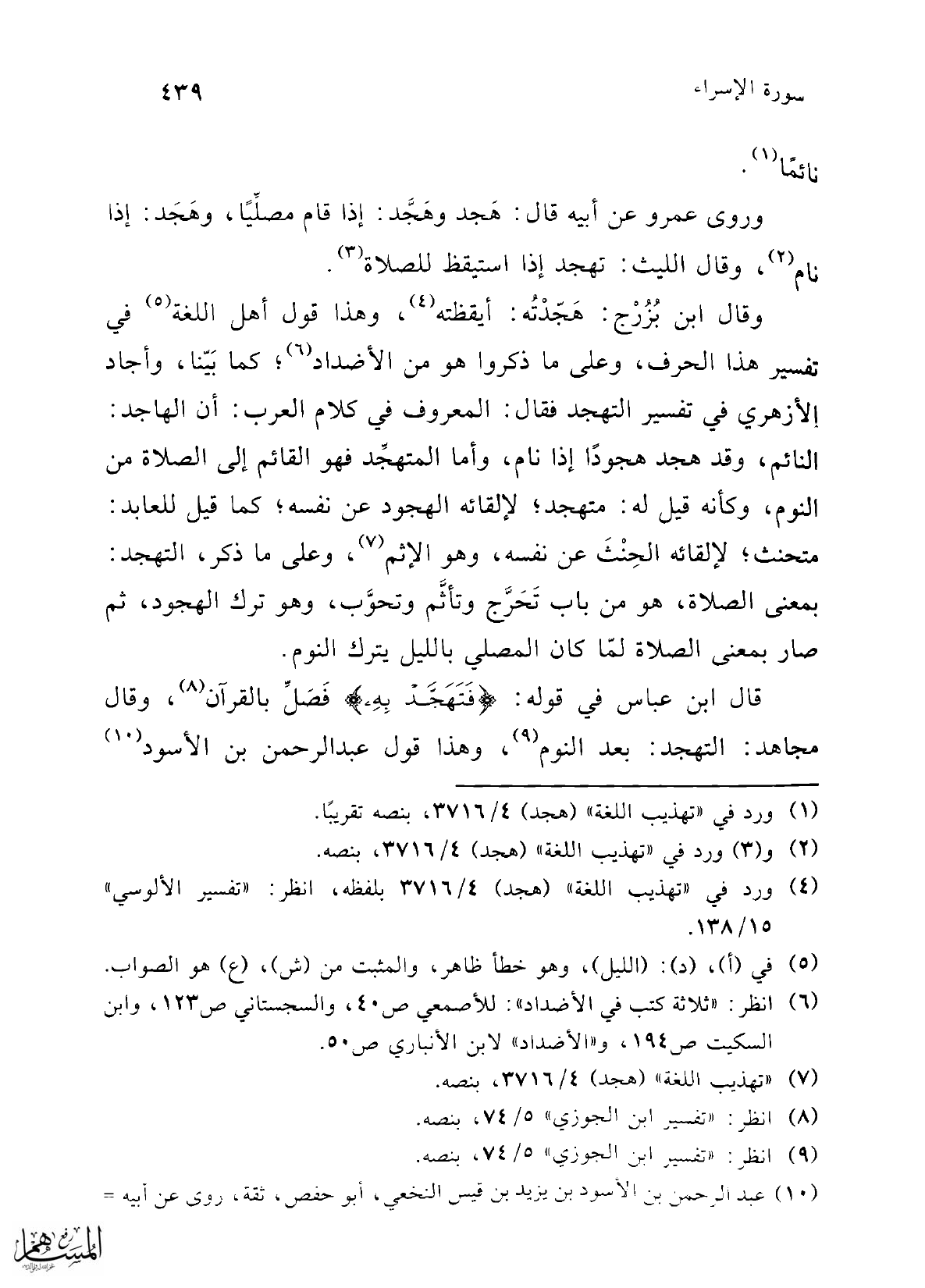(4) ورد في "تهذيب اللغة" (هجد) 4/ 3716 بلفظه، انظر: "تفسير الألوسي" 15/ 138.
